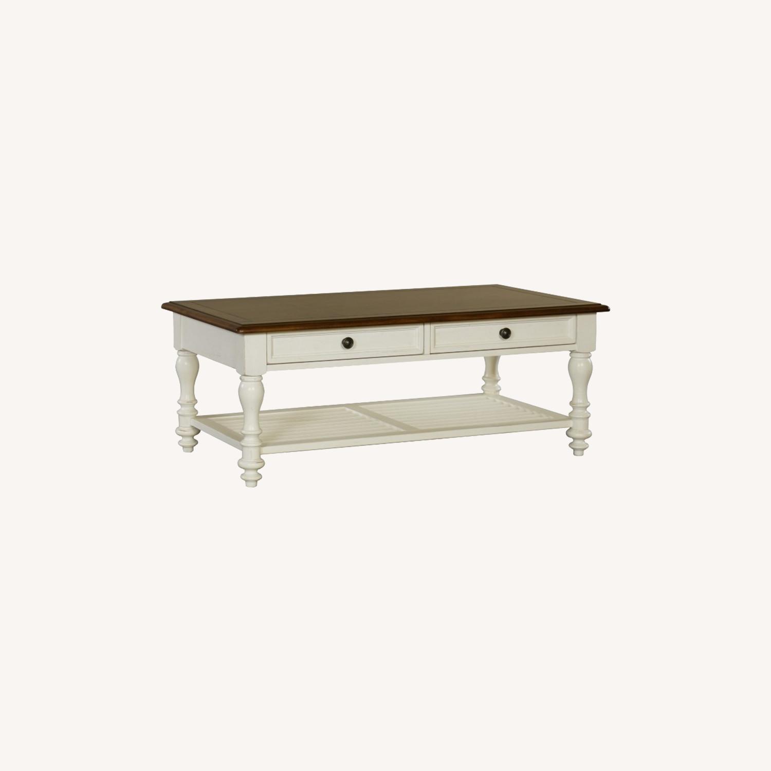 Seller's Notes:Create a charming atmosphere in your home with our Newport cocktail table. Crafted from hardwood solids and pine veneers and finished in a distressed white hue, this piece is attractive and well-made. The table top shows off natural wood grain while antique pewter finished hardware, turned legs and louvered a fixed shelf add decorative accents. Multi-step distressed white finish A rub-through technique shows off natural wood grain Two dust-proofed drawers with full-extension side guides Antique pewter finished hardware Fixed shelf with louvered detailing Turned legs Crafted from hardwood solids and pine veneers Slight imperfections in the wood add to the beauty of the piece Colors may vary slightly on different monitors