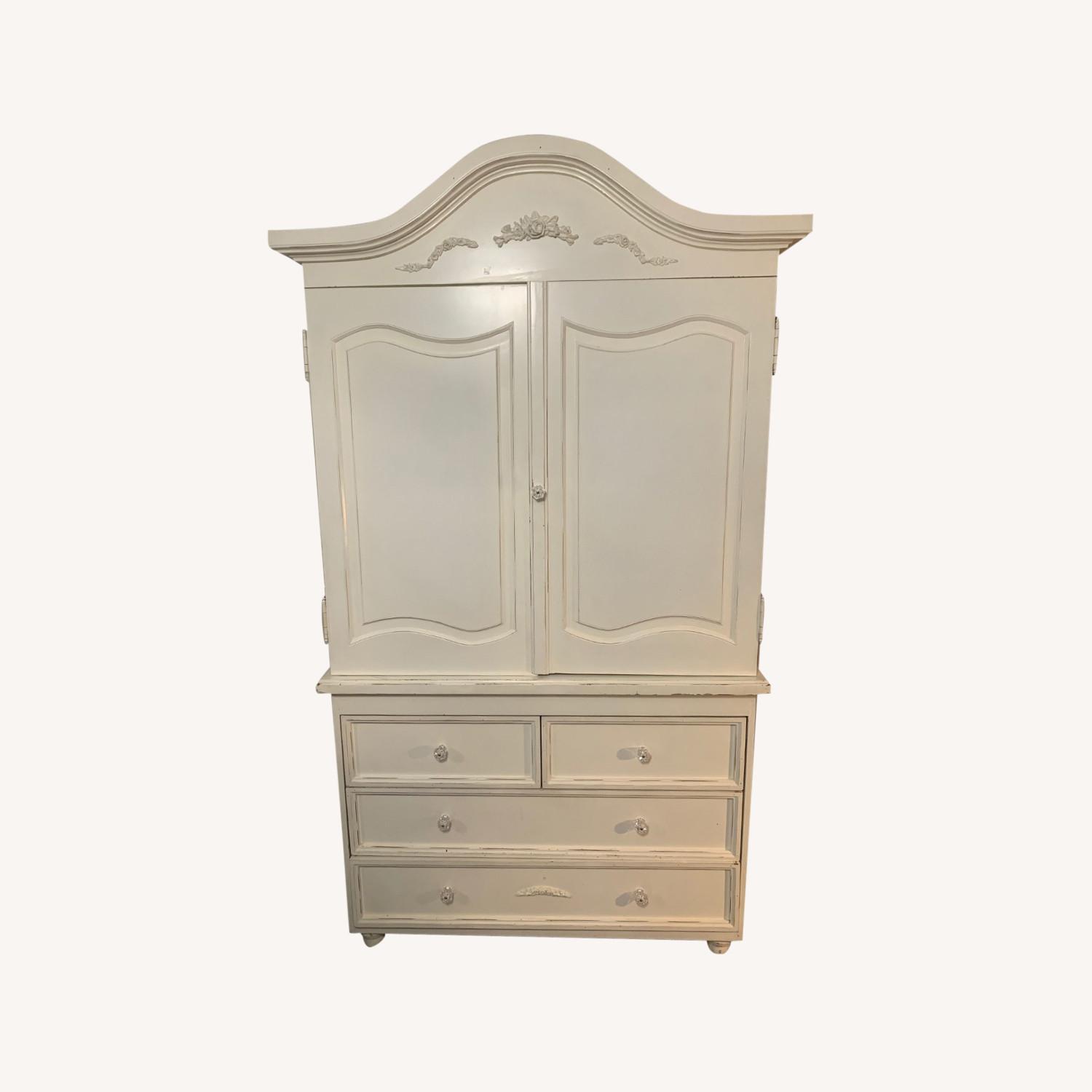 Seller's Notes:Antique White Armoire from Newport Cottages Collection. There are three section of drawers on the bottom with crystal knobs, two larger ones on the bottom with the top split into two. The bottom drawer has the embossed flowers that match the top of the armoire and the rest of the set that we had in both antique white and antique pink. The top opens like a cabinet with three big sections separated by two shelves. The top has a crest of the embossed flowers that match the rest of the bedroom set in this Newport Cottages Collection that was part of Classic Furniture and is quality reproductions of antique furniture.