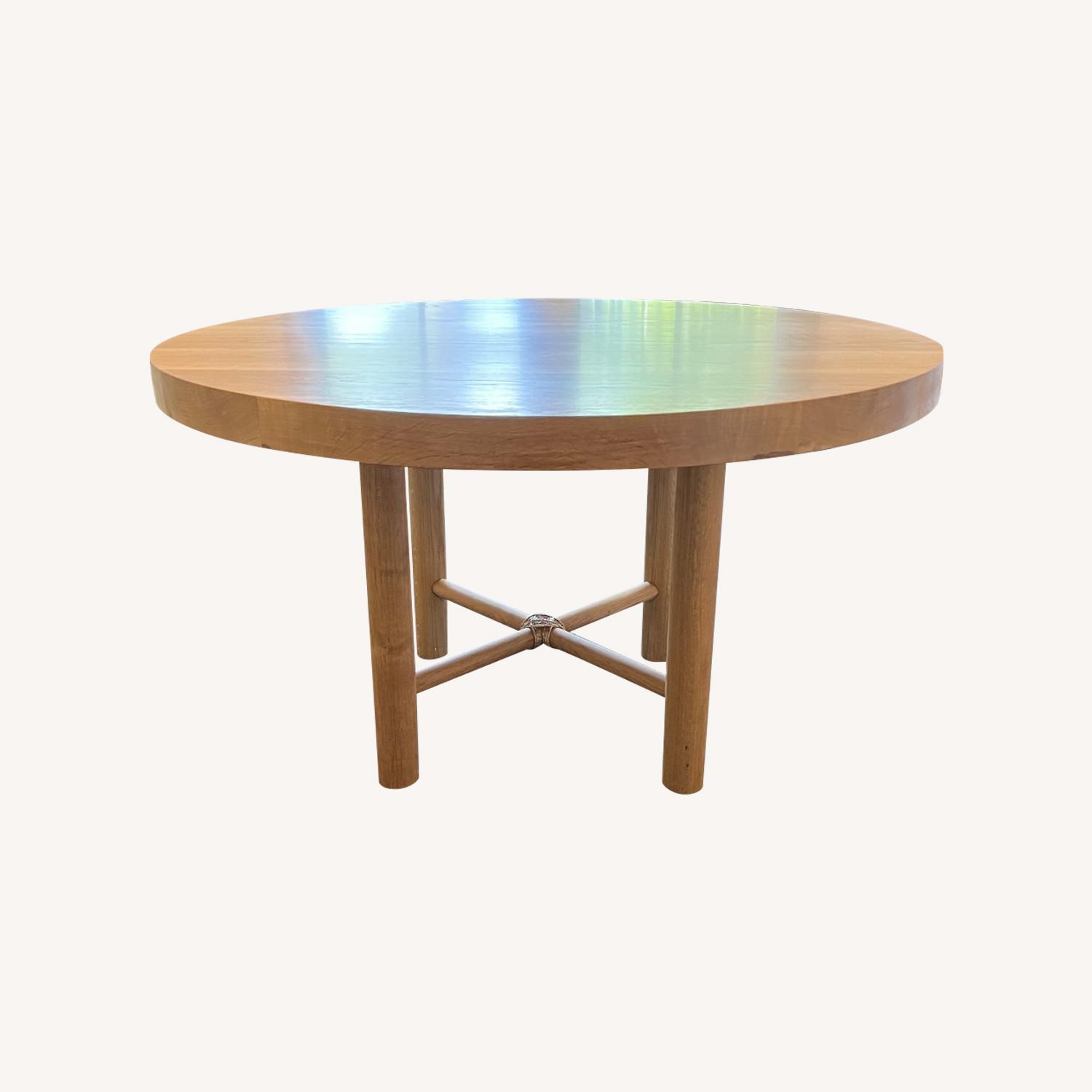 Seller's Notes:Custom Nickey Kehoe Round Dining Table. Handmade in Los Angeles. In excellent condition. Every table tells a story. This one is a page-turner. An impressively solid, 3-inch oak circular dining table has solidity with a light touch, featuring seagrass lashing detailing. Informally formal, it’s meant to be the heart and soul of any living space.