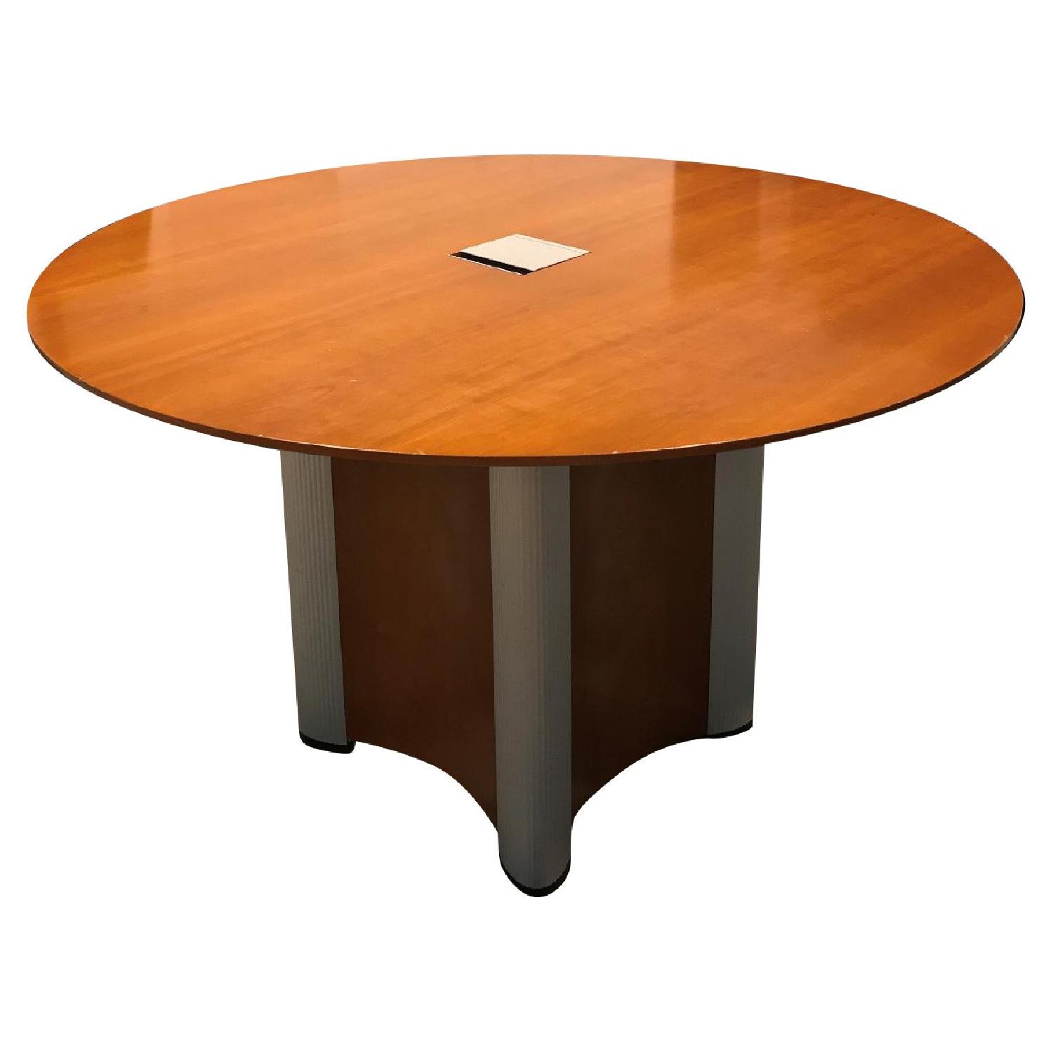 Seller's Notes:Nienkämper Vox Office Meeting Table in cherry wood with quad base. Includes concealed power source and all cords. Has experienced light use over ten years and thus surface has minor dents as pictured. On one side of the base there is a small split, on another side the scratches that are pictured. Difficult to detect unless looking very closely.