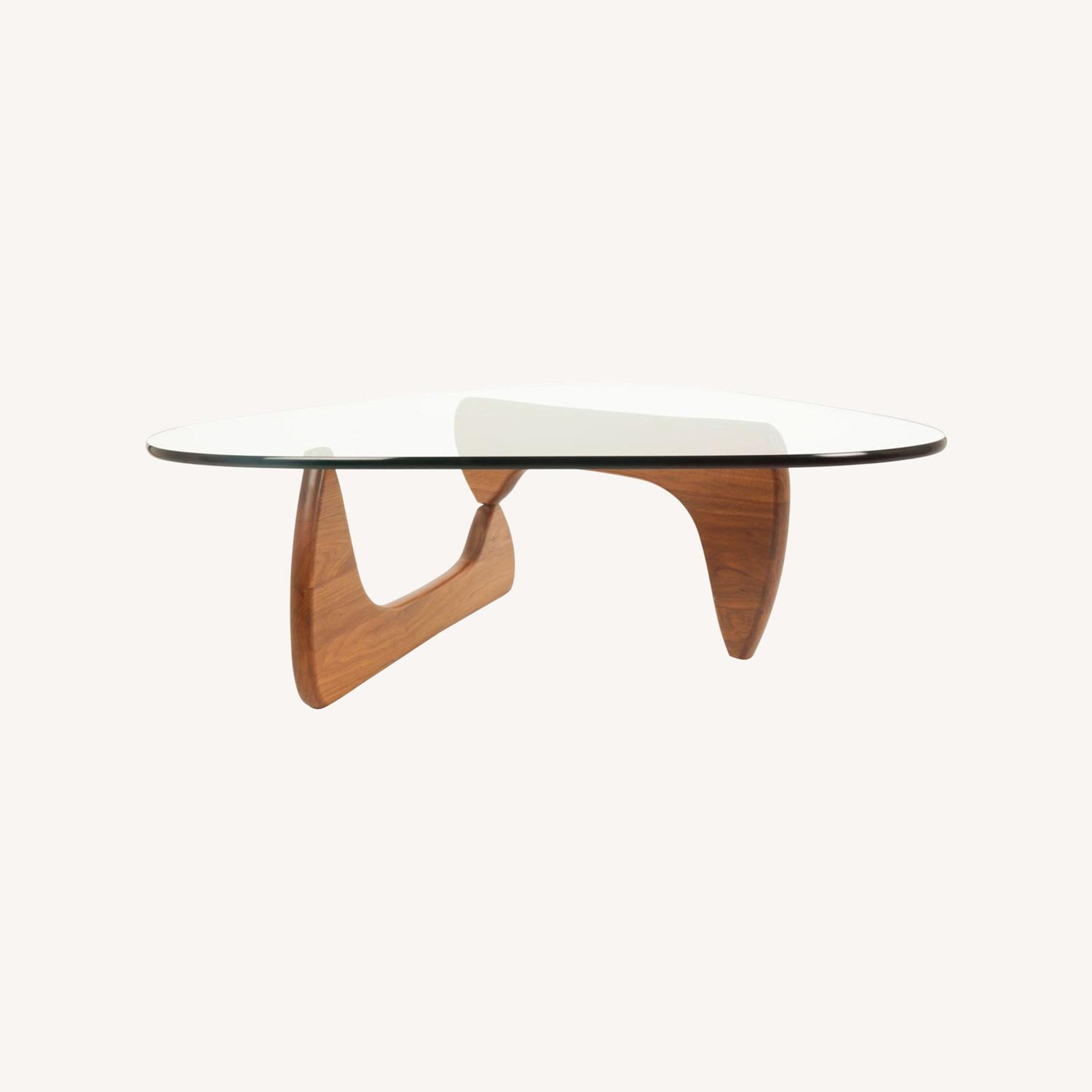 The Iconic Coffee table has become a design classic and a masterpiece of form and function ever since its design. This table consists of three basic parts, a beautiful thick glass top, and two identical wood pieces. It is both a work of art and a piece of fine furniture. The thick toughened glass rests on two curved solid wood legs that interlock to form a tripod-like base. This exceptional reproduction is made from the highest quality materials and workmanship to provide you with countless years of enjoyment. Available in walnut and natural finish.