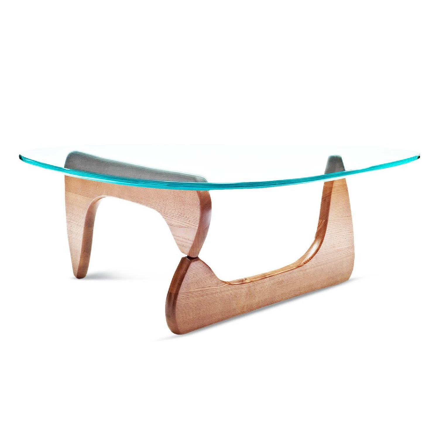 Seller's Notes:The Tribeca Coffee Table originally designed in 1944 by Isamu Noguchi has become one of the most distinguished pieces of furniture of the century. The Tribeca Coffee Table is a reproduction featuring a rounded triangular top lid made entirely of glass and an asymmetrical two-leg composition. The leg component is made of quality wood strong enough to hold whatever you please, plants, paperwork, office supplies, etc.