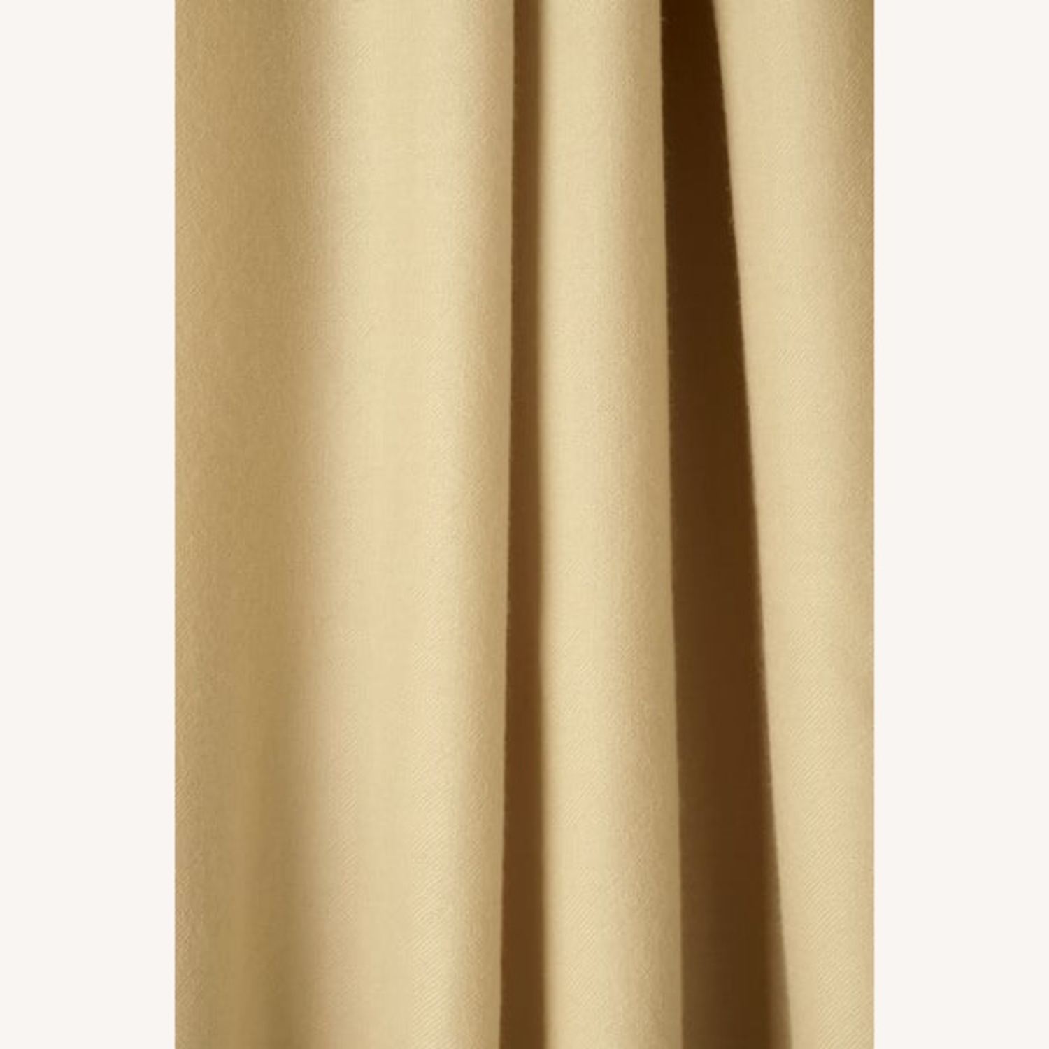 Seller's Notes:Brand new beautiful wool butter yellow curtains. I have 4 panels, 3 of them have not been taken out of their bags and one was hung up very briefly for photos- no exposure to pets . Selling them because I decided to go in another direction. Can be hung on a track with hooks or on a pole, photos taken on tracks. The curtains do not include the hooks.