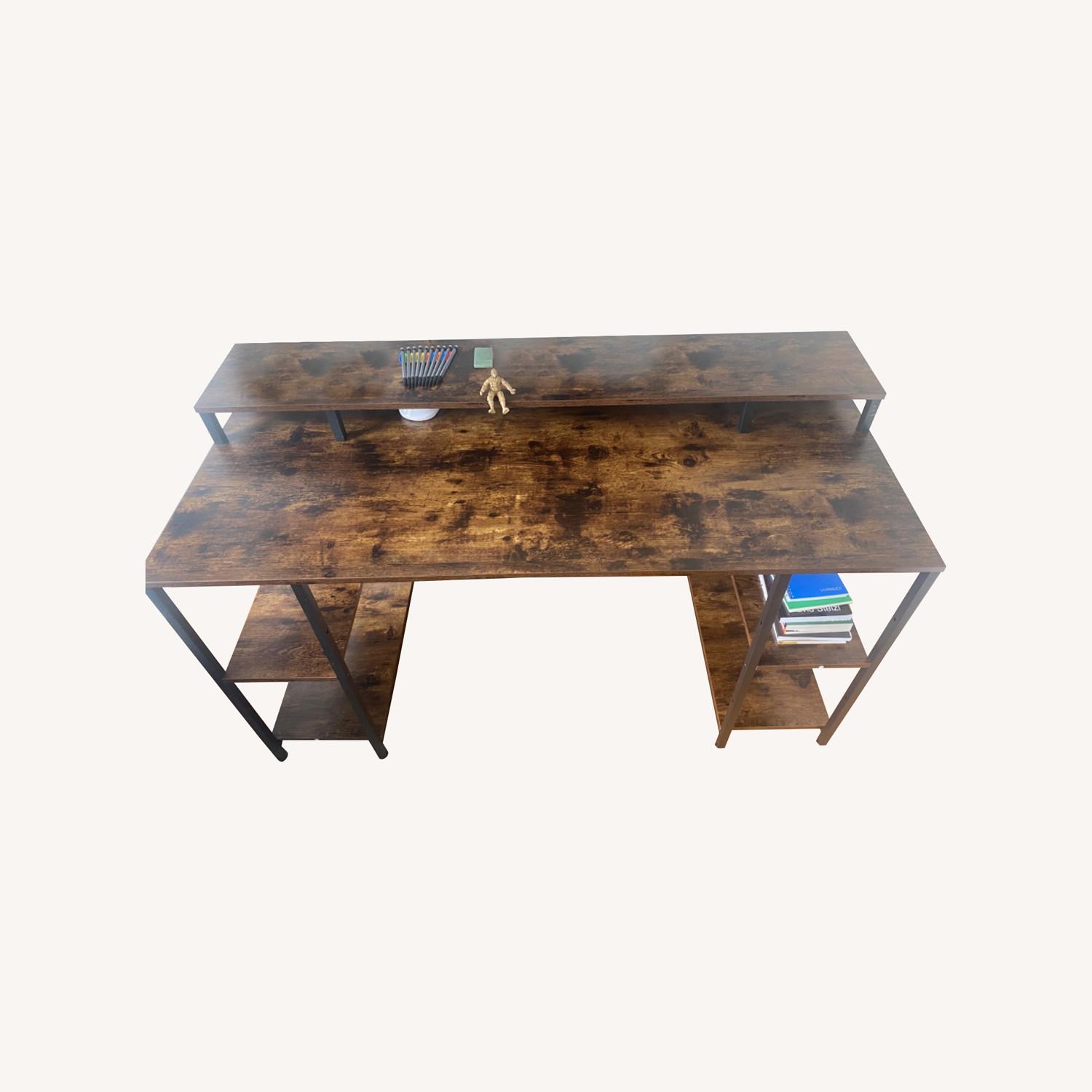 Seller's Notes:Nost & Host 55 Inch Dual Monitor Desk, Computer Desk with Monitor Shelf and Storage Shelves, 2-Tier Industrial Office Desk Sturdy Writing Gaming Study Table, Rustic Brown