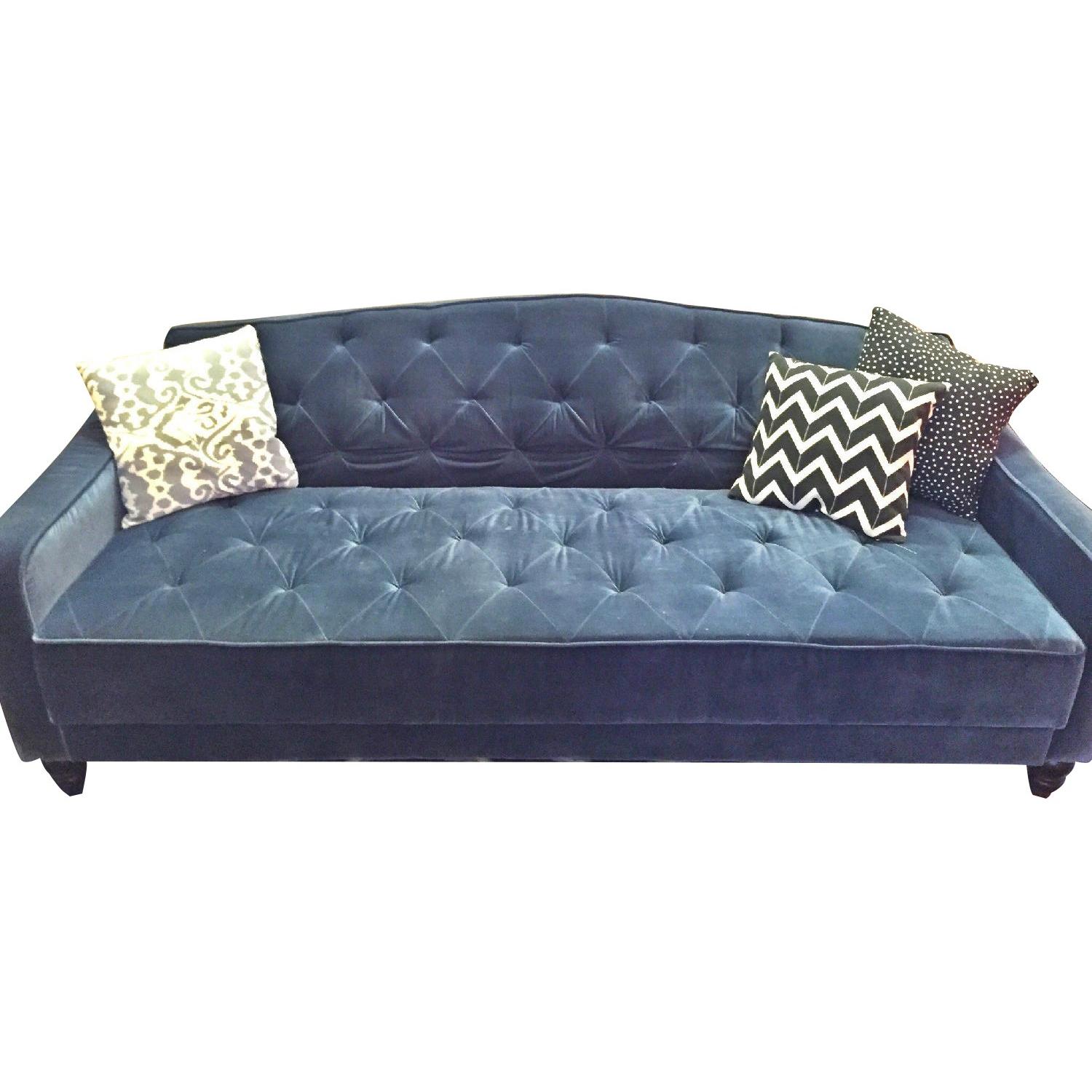 Seller's Notes:I'm heartbroken to part with this sofa/daybed but I'm moving in with my boyfriend and simply don't have room to bring it with me! It's one year new and has beautiful velour upholstery with diamond tufted cushions. It has 3 easy to convert positions: sitting, lounging, and sleeping. It's in a non-smoking home. Couch dimensions: 81.5"W x 34.5"D x 33.5"H Sleeper dimensions: 81.5"W x 44"D x 17.5"H