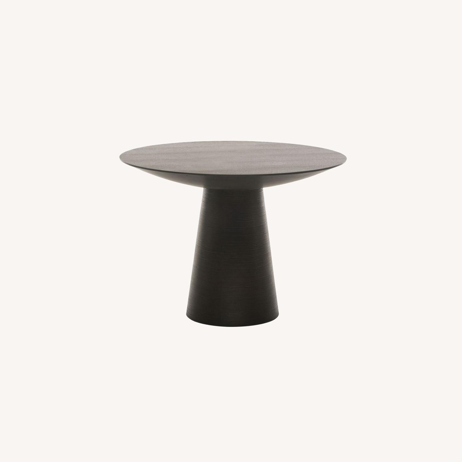 Seller's Notes:This is a striking table that could be used as a small dining table or entry table. The style is inspired by contemporary Japanese design. The base plinth is ribbed and overall the piece is very sculptural in design. Black veneer wood top and base. Was used for less than a year and is like new. Retails for over $1400.