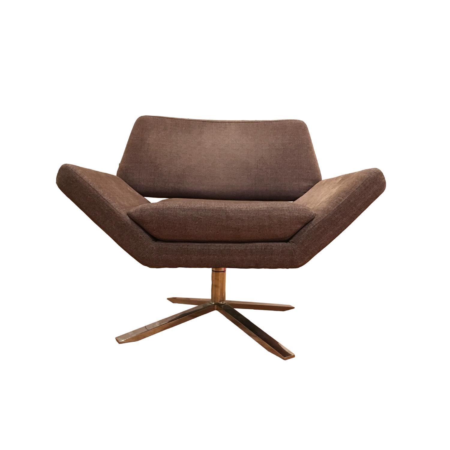 Seller's Notes:SLY CHAIR. Elegant Modern Swivel Lounge Chair from the Nuevo Living Collection. Like New. Sturdy, lightly used, no stains, odors or discoloration. From a smoke free home. Color is a deep warm grey, easy clean fabric that is soft to the touch. A great chair to curl up in. Chair clearance is 10" off of floor. Base takes up about 29" square. Cushion is foam, 20" wide by 24.5" deep.