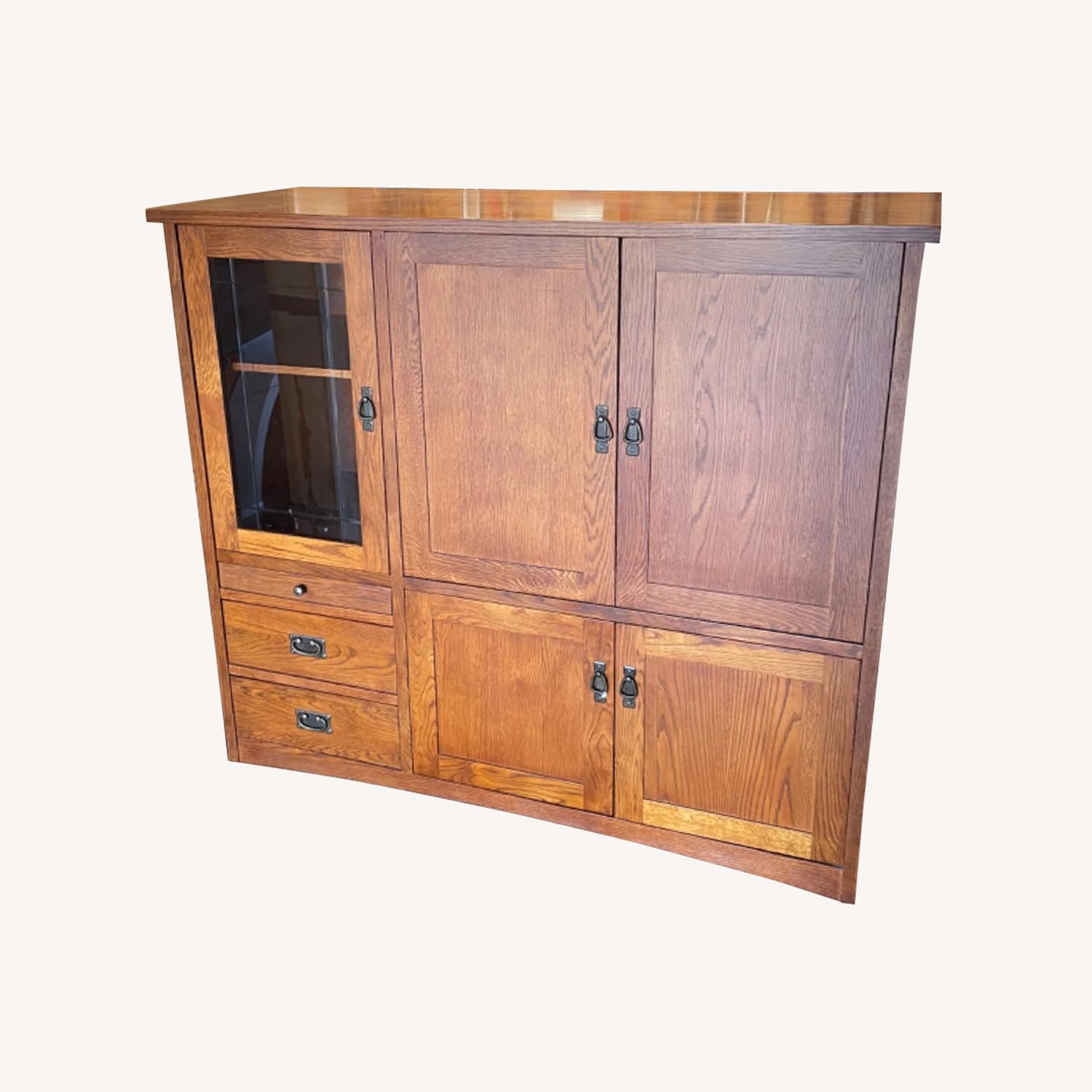 Seller's Notes:Sturdy entertainment center, solid oak, in great condition. Beautiful glass doors on media side, side retractable doors in front TV bay. 29” high by 34” wide TV Bay.