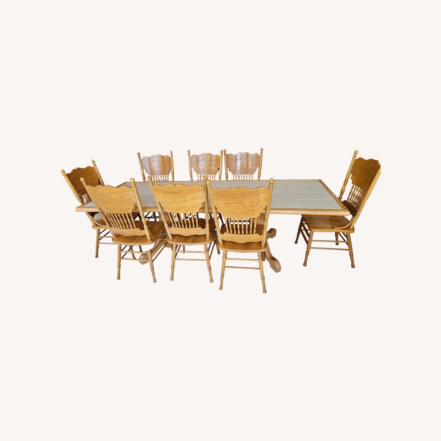 Seller's Notes:Solid oak table with tiled top and 8 matching chairs with beautiful detailing