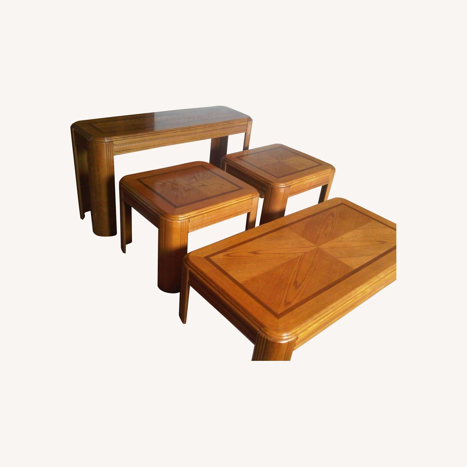 Seller's Notes:Beautiful oak veneer coffee table set. Includes side tables and sofa table. Good condition. Coffee table has minor scratches on the leg. Many years of use left.