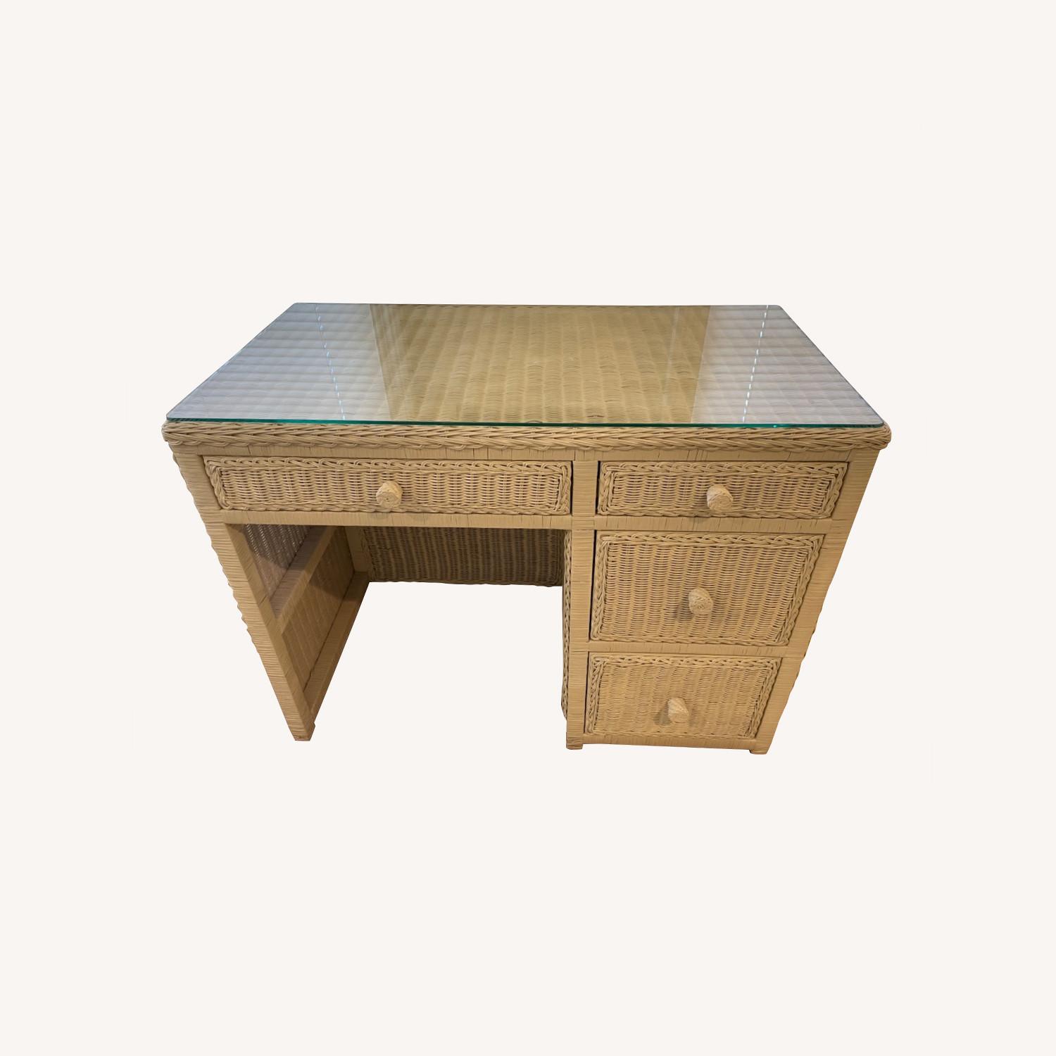 Seller's Notes:A well cared for and very sturdy wicker desk. Off white color. Custom glass top with rounded edges included. Also available is matching chair Custom glass top included)