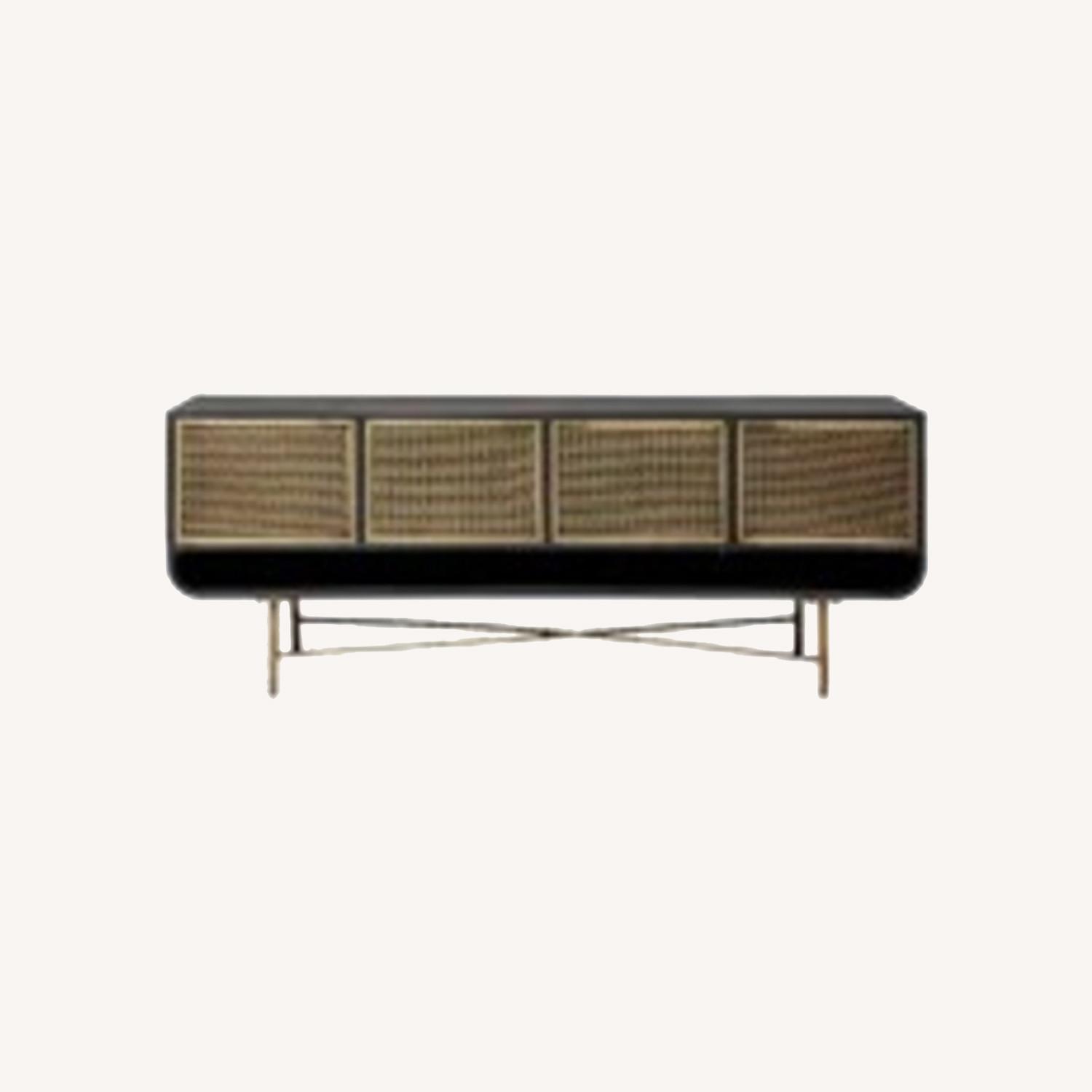 Seller's Notes:/// AptDeco will pick up the item and deliver it to your place for a flat rate fee! Self-pick-up possible! /// Metal carbon black and golden brass color TV stand. Old Hollywood glam