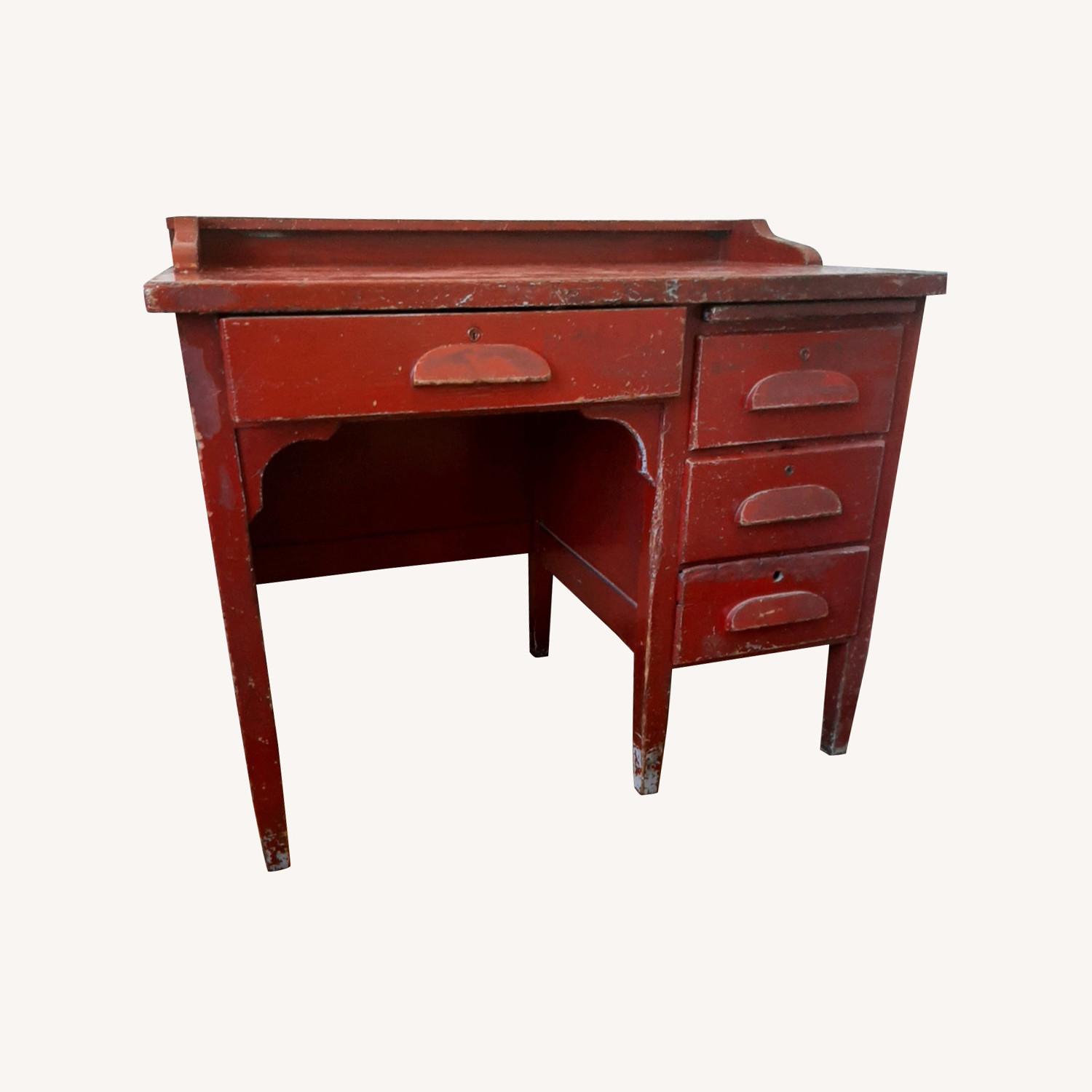Seller's Notes:This is a sturdy & practical desk. When I got it years ago, it had a NYC public school lunch ticked in a drawer, so I think it was originally a teacher's desk. All drawers have incorporated wood pulls. Could easily be repainted a fun color, stenciled or whatever. Perfect if you're looking for a non-flimsy, solid wood piece from which to work from home!