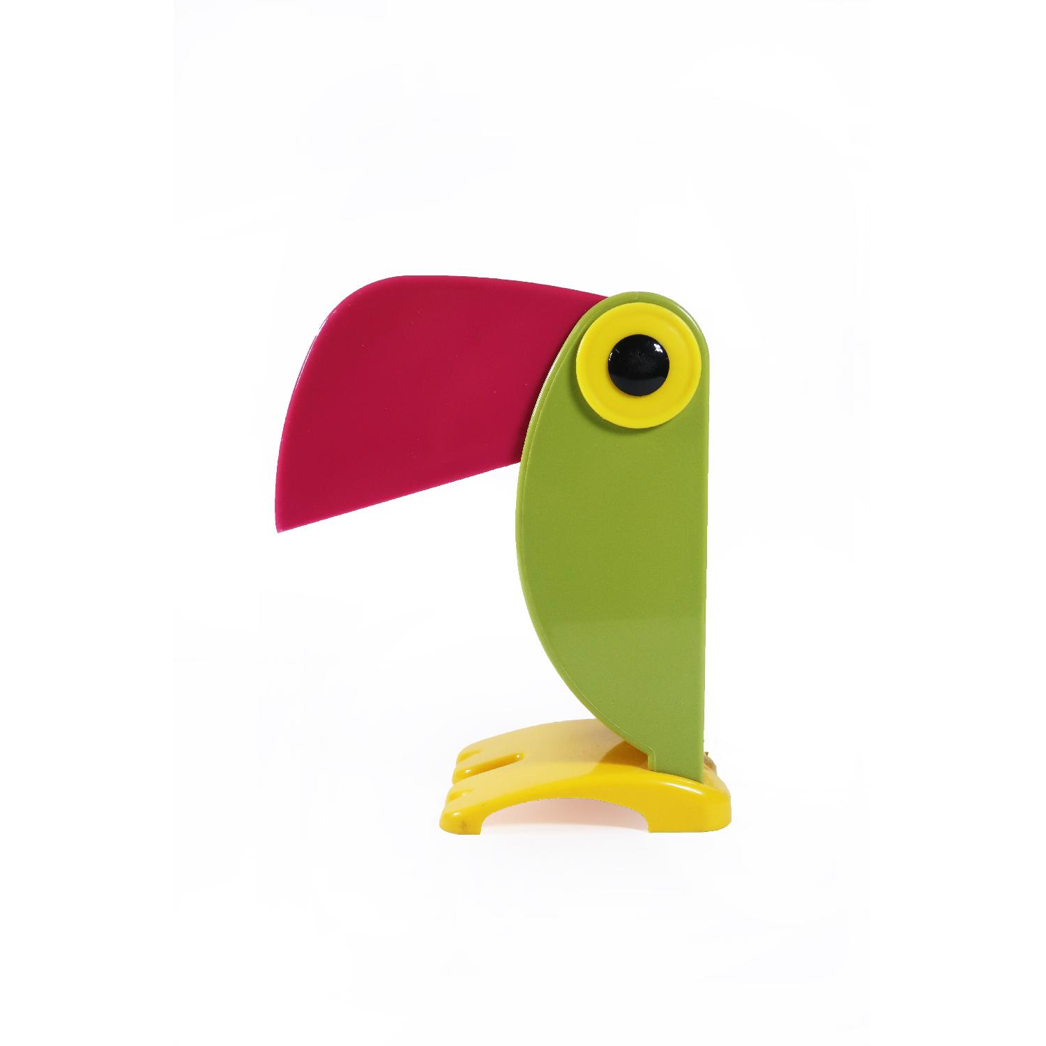 Seller's Notes:Released in 1968, this Italian Modern plastic desk lamp by Old Timer Ferrari of Verona, Italy has a green body, orange beak, yellow feet and eye with a black pupil. By opening and closing the beak, the light can be dimmed or brightened, or the lamp can be closed for storage. When open, the abstract shades of plastic join together to be a Toucan. In great vintage condition with no cracks or refinishing. Beak is a little tight to open when closed, but with a couple tries you’ll figure out the trick. (This is an issue with all of the lamps of this design.) Uses a normal E14 bulb, fully functional and original. Perfect for a child’s bedroom, an adult’s desk, or anyone's living room. 3.75” x 4.5” x 8”