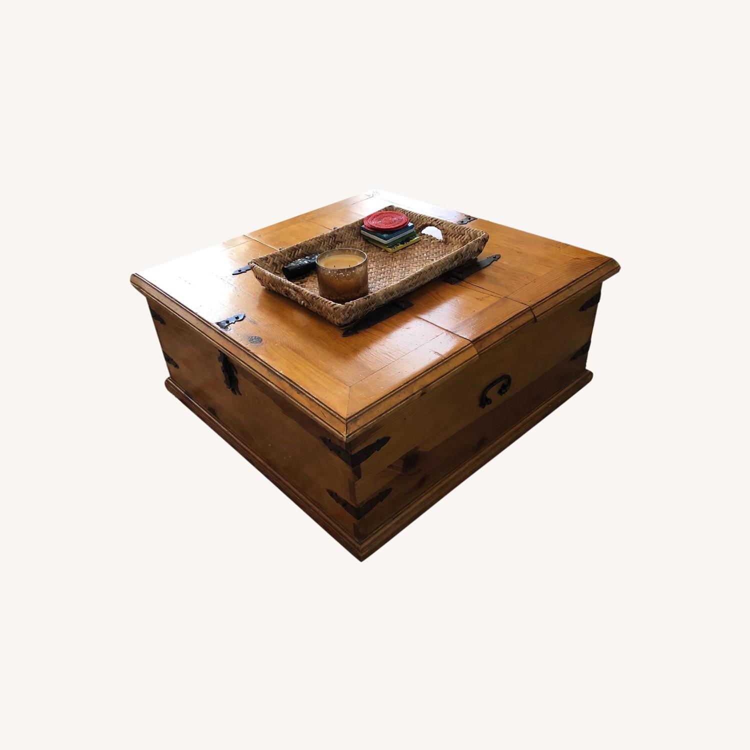 Seller's Notes:Handmade from California. Similar to a Pottery Barn style from seasons past - now they show one virtually similar just more distressed. Can be a mainstay in your home, just restain or distress if you do not like the scratches. Fantastic for storage and a good size to be used around a sectional. Don't worry about putting your feet up, that's part of the charm!