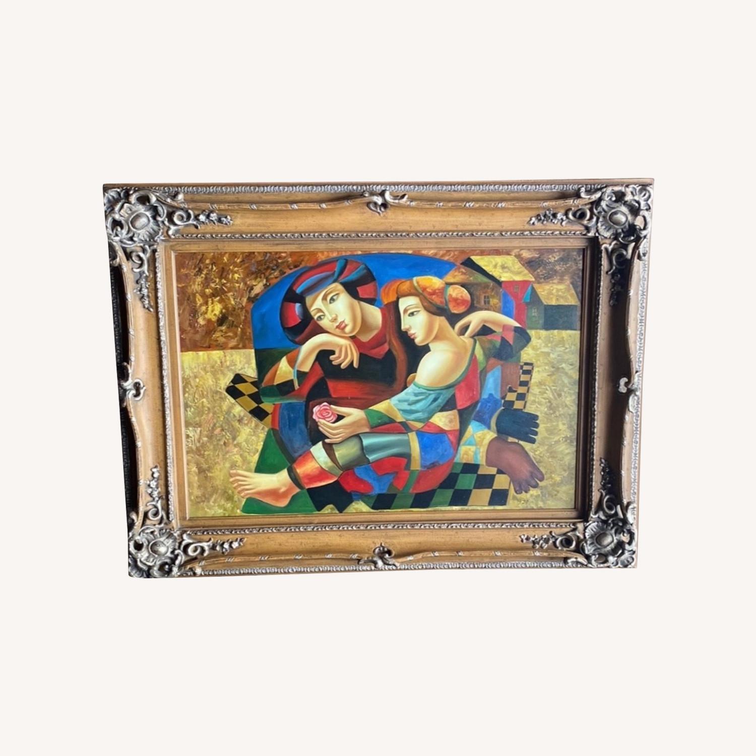 Seller's Notes: very high end ornate solid wood frame hand made + hand painted 47"w, 35"h, 3.5"d; paid $950 just for Just for frame; Art was won at a art auction for fundraiser. Art inside is a professional painting that comes with certificate