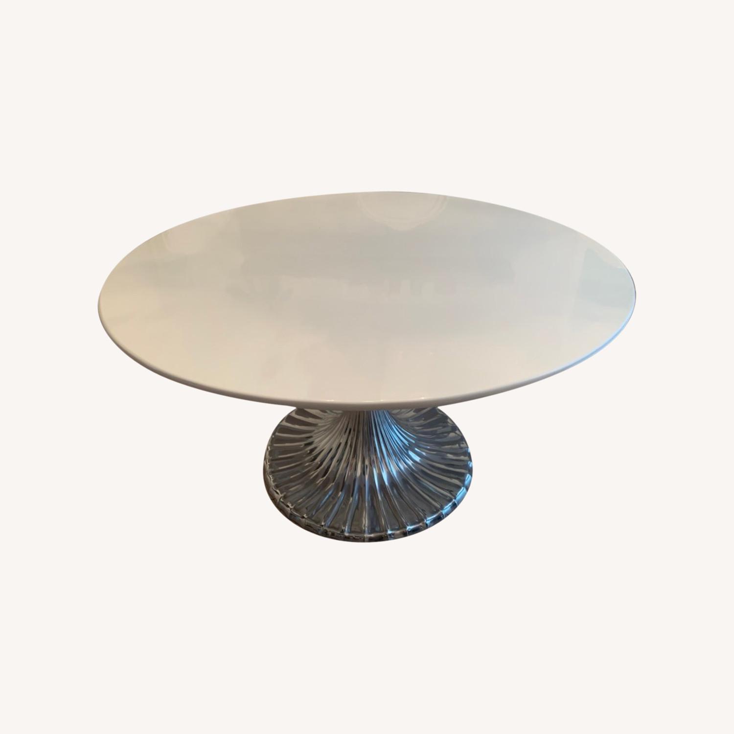 Seller's Notes:Beautiful round dining table in white melamine with metal stand. Purchased from Oly Studio in Tribeca.