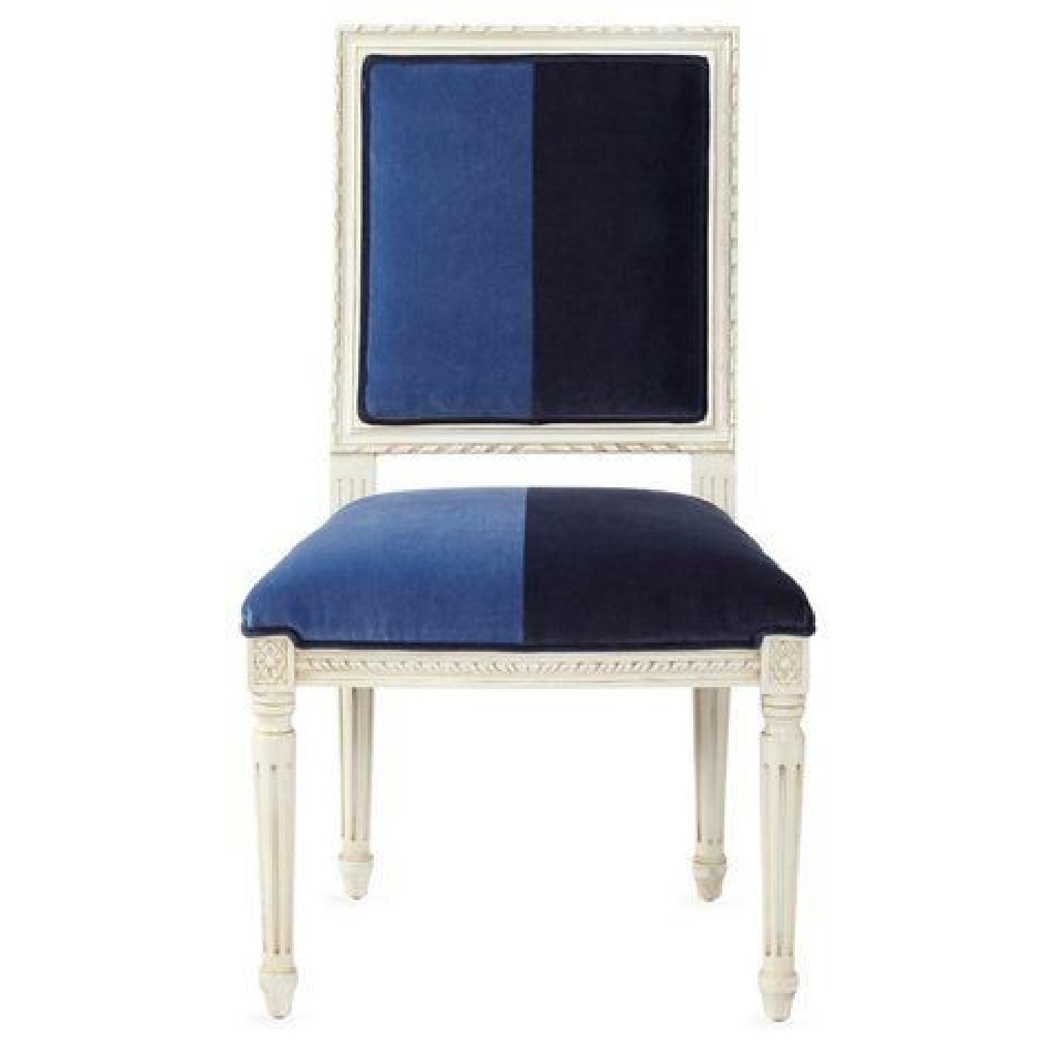 Seller's Notes:These Exeter siode/dining chairs - set of 3 from One Kings Lane look stunning, the blue velvet cotton is comfortable and cosy while the frame's details add quality to the look of the chairs. In a home with no kids, pets or smoke barely been used - grab this bargain now! Frame, Indonesian mahogany; upholstery, cotton velvet; fill, polyurethane foam wrapped in down with cotton duck core