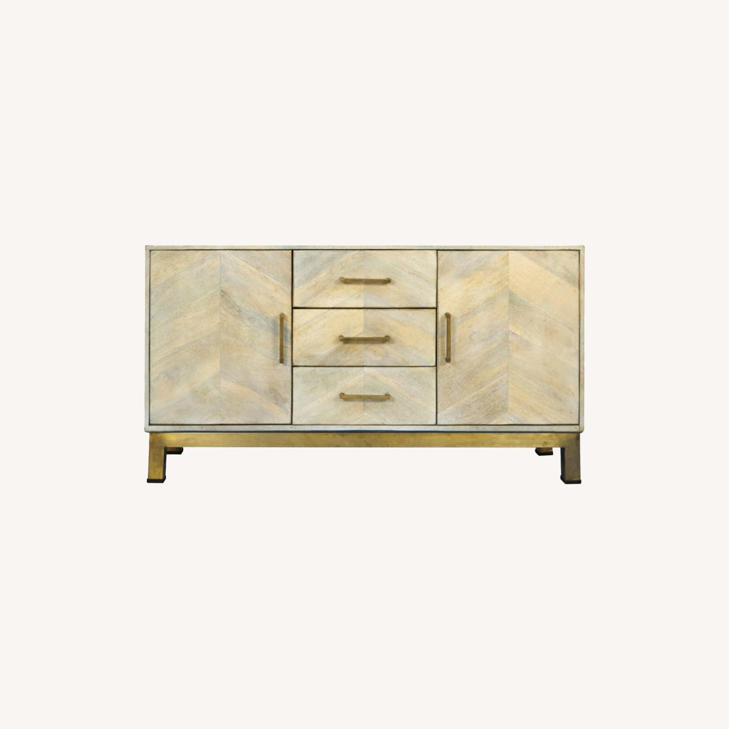 Seller's Notes:Inspired by the grace of Roman architecture, this stunning credenza is crafted of bleached mango wood in a stunning parquetry design with gleaming brass-finished hardware. The piece includes two cabinets and three drawers for ample storage space. Charming cobalt blue interior. Excellent Condition.