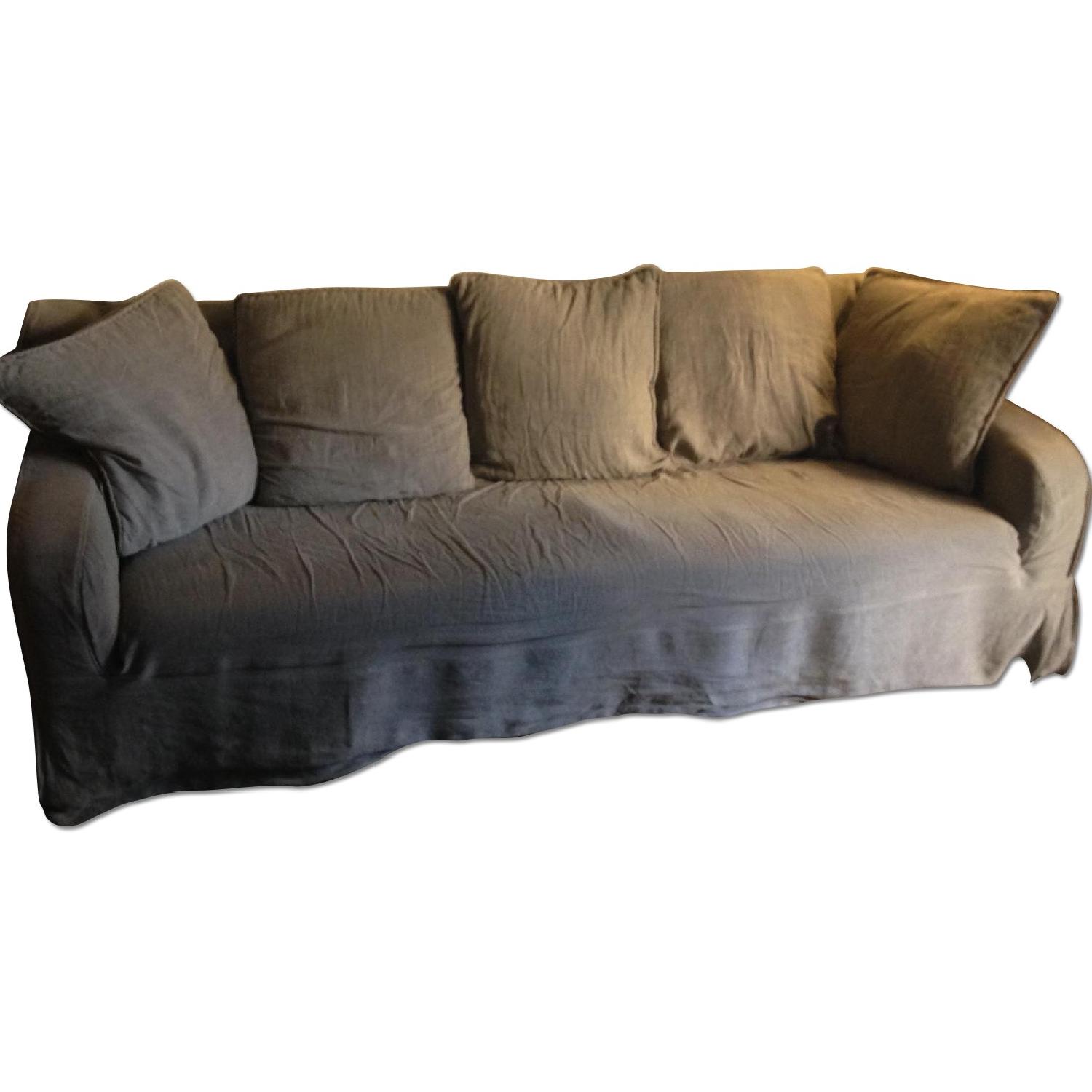 Seller's Notes:One Kings Lane "Wilshire 90" Sofa, Dark Pebble" linen couch for sale. Original: https://www.onekingslane.com/product/25226/958777 Purchased brand new 2 years ago and very lightly used, in excellent condition. Slip cover removable. Comes with 5 Pillows and pillow covers, with new plush interior pillows purchased 6 months ago. Owned by non-smokers with no pets. Soft grey color. No stains at all. 90"W x 36"D x 35"H Seat height: 18" Made of: frame, birch; upholstery, linen; fill, foam