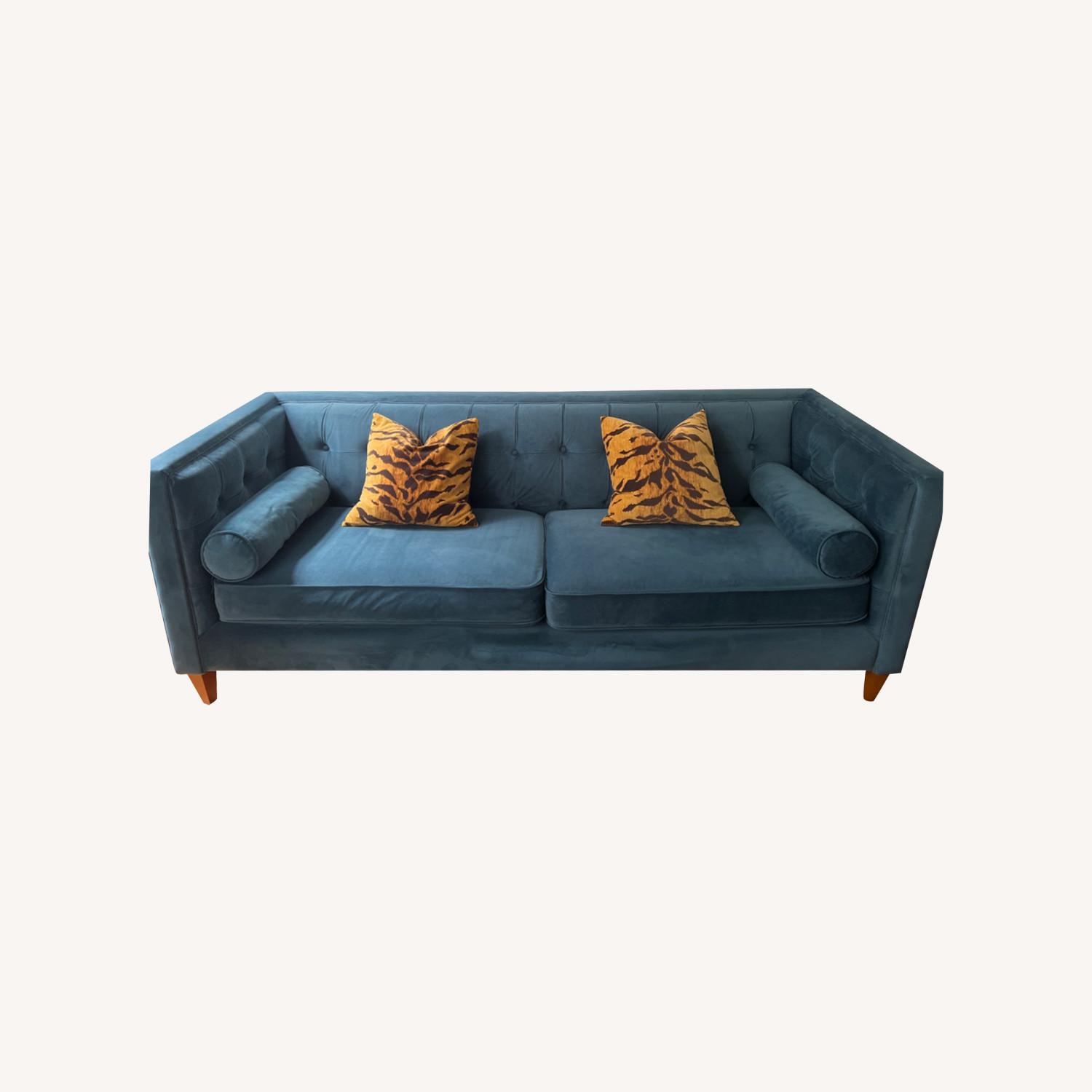 Seller's Notes:Gorgeous and very comfortable blue velvet couch. Originally purchased from an interior designer who bought it from one kings lane. Fits 2-3 people. Amazing statement piece - it always gets compliments! Minor blemishes and the bottom front part slightly sticks out for some reason, but is not noticeable.
