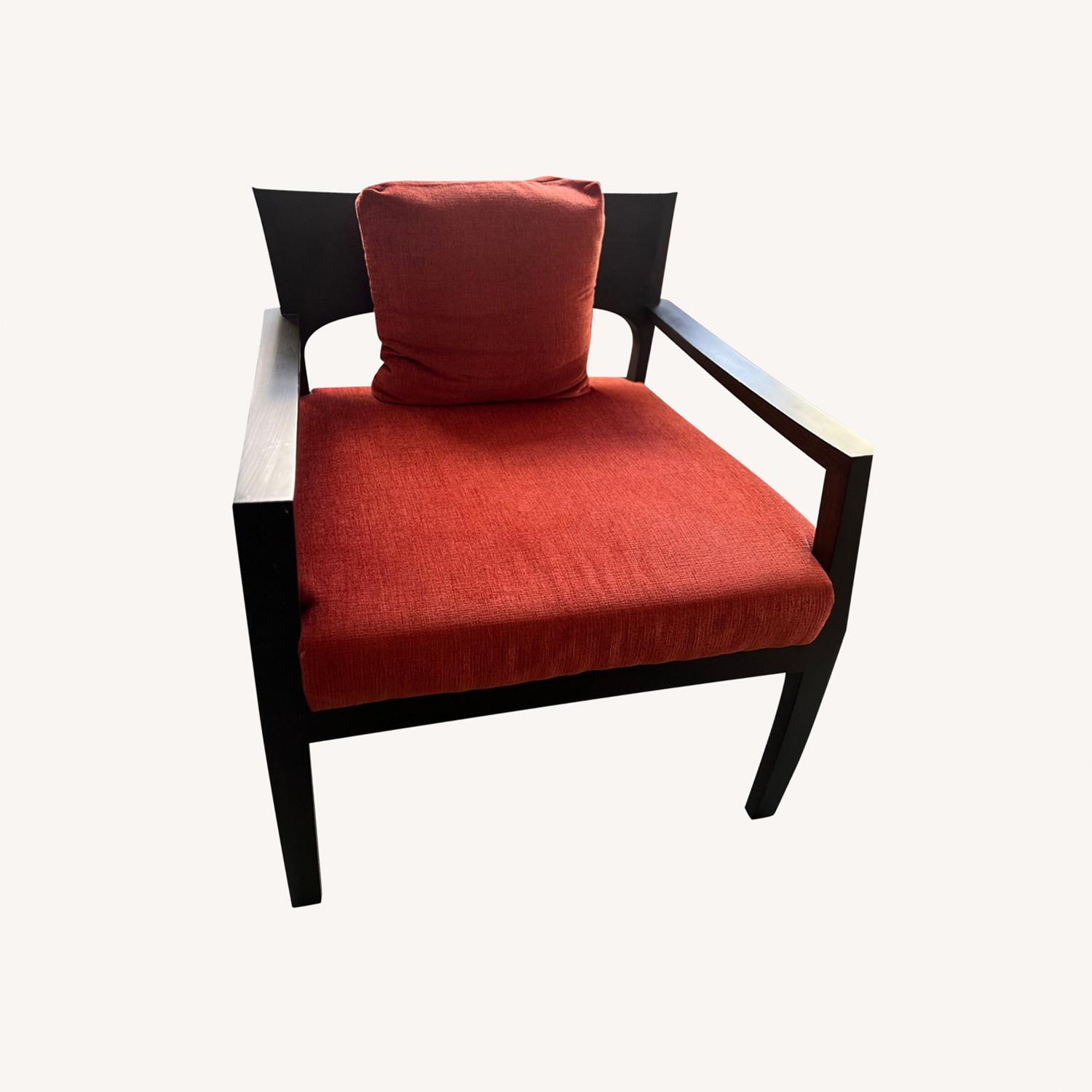 Seller's Notes:This bright orange and teak wood arm chair would add a beautiful pop of color in any room. It is in perfect condition with no stains. It has traveled with us from India to Singapore to New York!