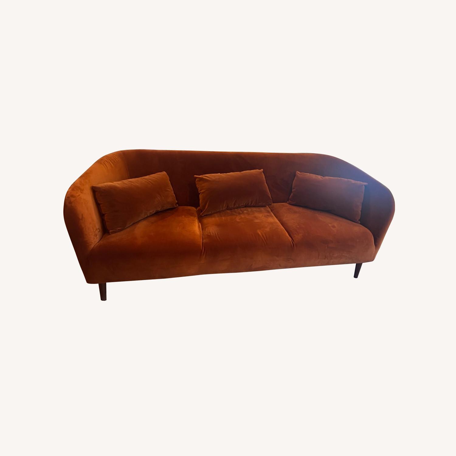 Seller's Notes:Burnt orange velvet couch from Danish company, SOFACOMPANY. Scandinavian/MCM design, with dark wood legs (can be removed). Couch is in great condition, no stains, blemishes, or marks. I am in a smoke-free and pet-free house. I have absolutely loved this couch and always receive compliments on it! Great statement couch that adds warmth to any room. I am remodeling, hence why I am selling this couch.
