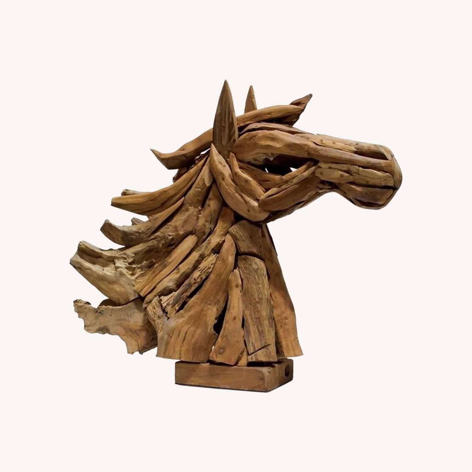 Seller's Notes:Striking handcrafted teak driftwood horse head sculpture. Made from reclaimed teak wood, each piece is entirely unique. This is a substantial, sculptural decor piece that makes a strong statement in a living room, entryway, loft, or office. Dimensions: 37” H x 30” D x 12.5” W Solid teak wood. Heavy and stable. Excellent condition with normal wear consistent with reclaimed wood. No structural issues. Retail pieces of this scale typically sell in the $600–$900 range. Located in Brooklyn.