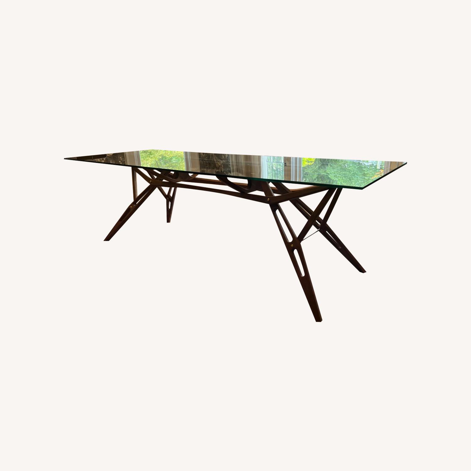 Seller's Notes:Great dining table with a modern, yet mid-century design. The table has a tempered glass top and a skeletonized base made of American walnut. The table is held together with brass fittings which adds a nice dash of color. The table is very sturdy for any use and is an instant conversation starter. (Table ONLY, no chairs)