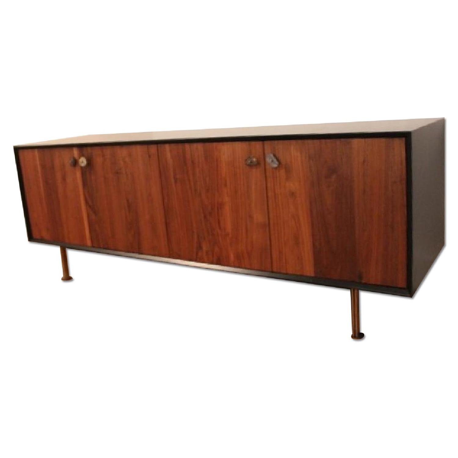 Seller's Notes:Mid Century cabinet from Organic Modernism. This piece is natural walnut and lacquer black with agate door knobs. First pics shown are in white for style and size reference. Minor wear with light scratching in one area on top. Also there is a hole drilled in the back for electronic cords.