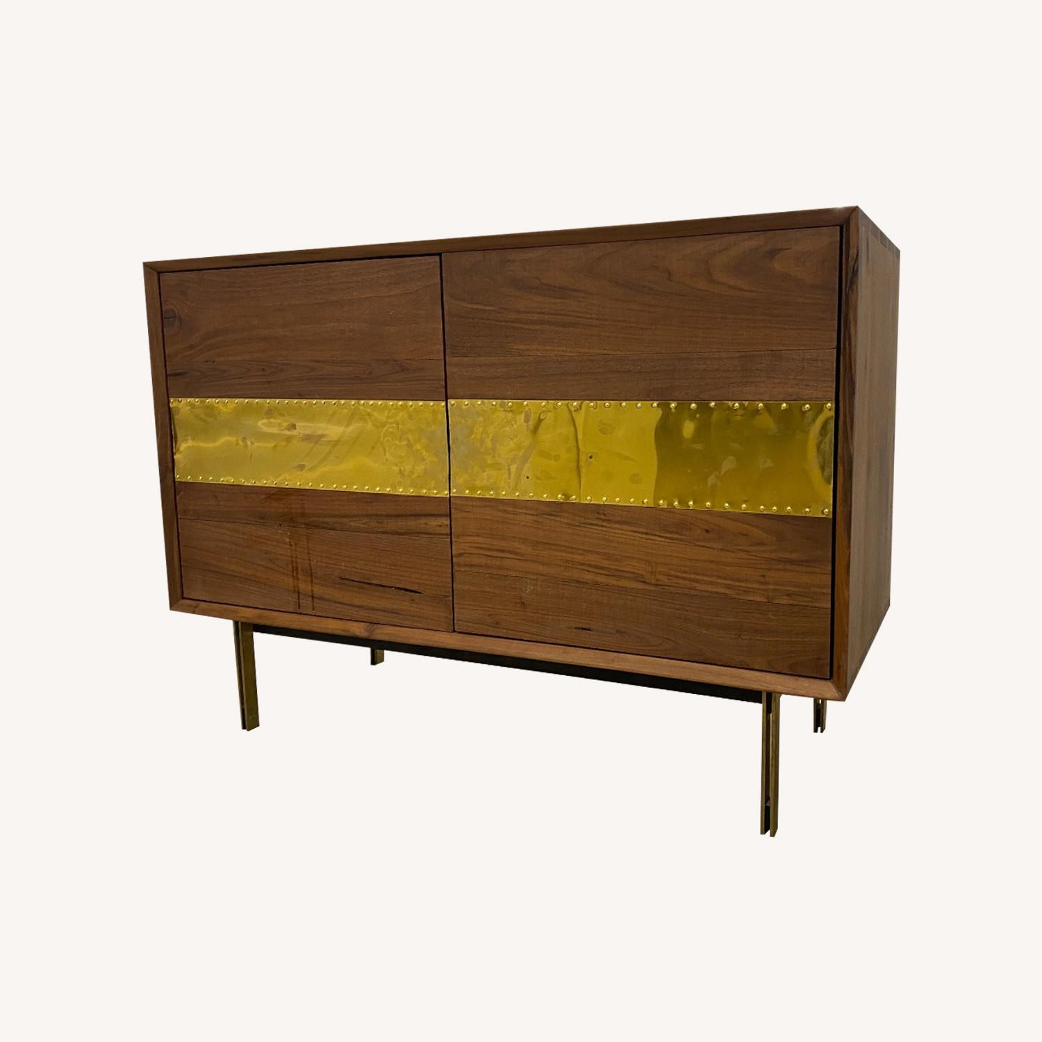 Seller's Notes:Solid walnut credenza with finger joint corners. Brass front detail and legs. Item is used for staging and photoshoots only. It's in very good condition. Brass front part may need some brass polishing. Close up detail: Front door done rough looking as a design purpose. Some close up images added to describe it better.