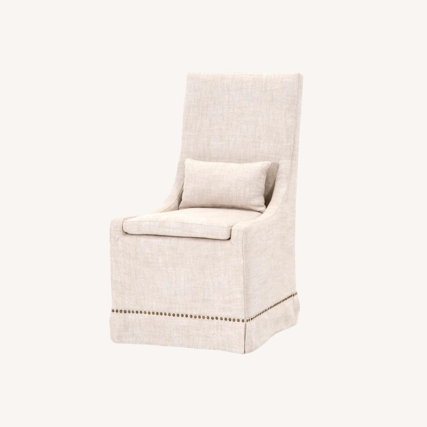 Seller's Notes:The chair is covered in Bisque French Linen with Gold Nails. It is slipcovered and includes a lumbar pillow. The seat cushion is removable.