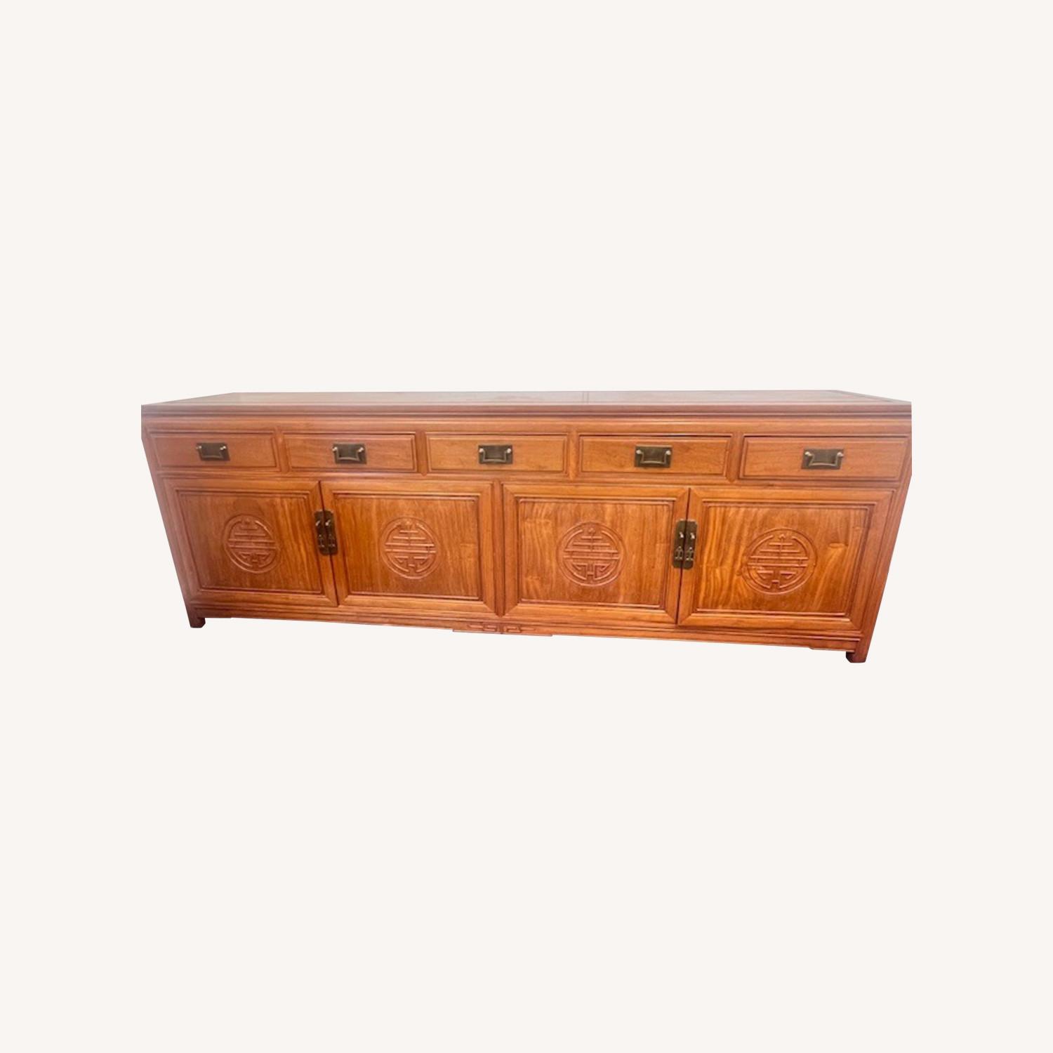 Seller's Notes:This handsome solid Rosewood Cabinet Features the Chinese symbol of Longevity on the doors. All hand carved with traditional Chinese joinery techniques, each drawer is dovetailed for long lasting durability. One removeable shelf is behind the carved door. Brass hardware. Wonderful addition for a dining room buffet, bedroom dresser or TV console.