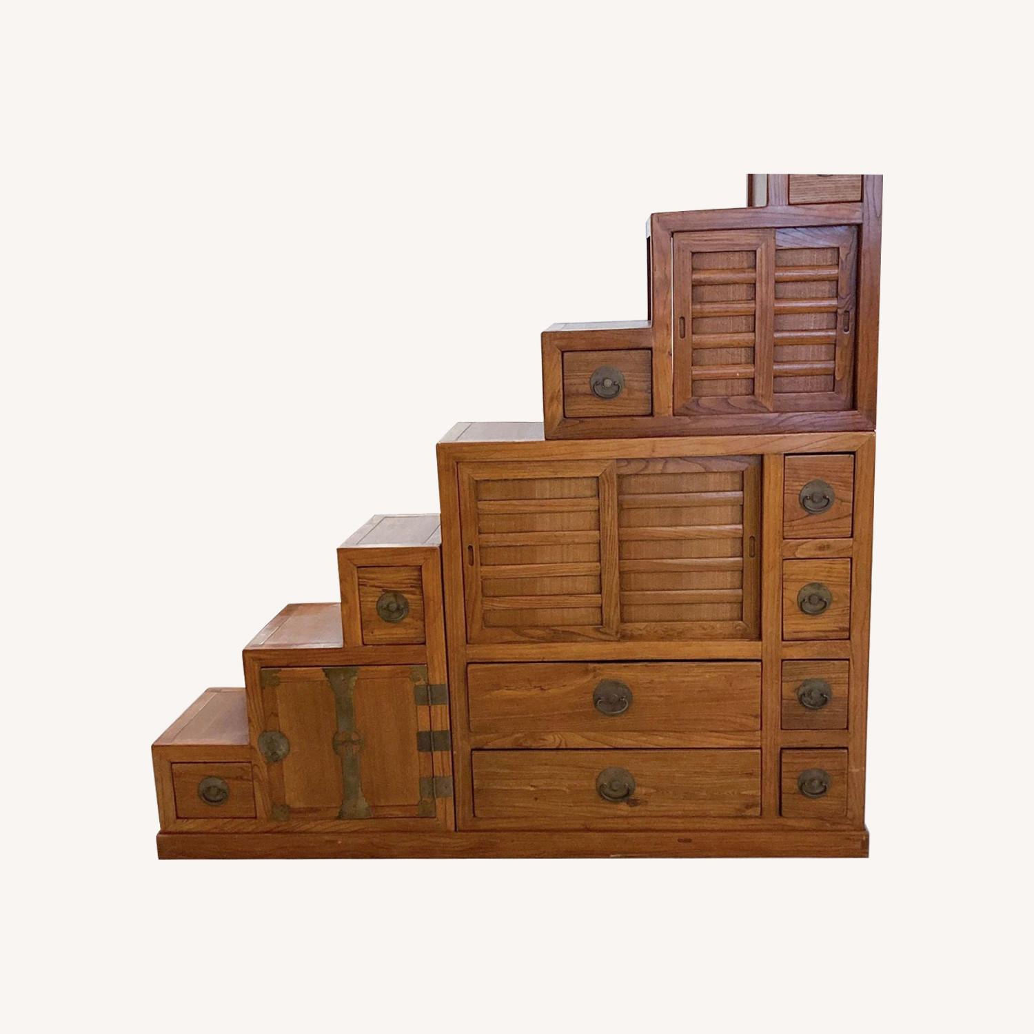 Seller's Notes:Description: Purchased in Itaewon, Seoul, South Korea, this Kaidan-Tansu or Step Chest is handcrafted of hardwood and features fine detailing including mortise and tenon joinery, dovetail drawer boxes, and traditional iron hardware with a mix of 12 drawers and 3 cabinets.. Gently used - any blemishes or damage will be included in the photos. #SKU: 2018045. Tags: liquidation,wood,transitional,metal,chinese