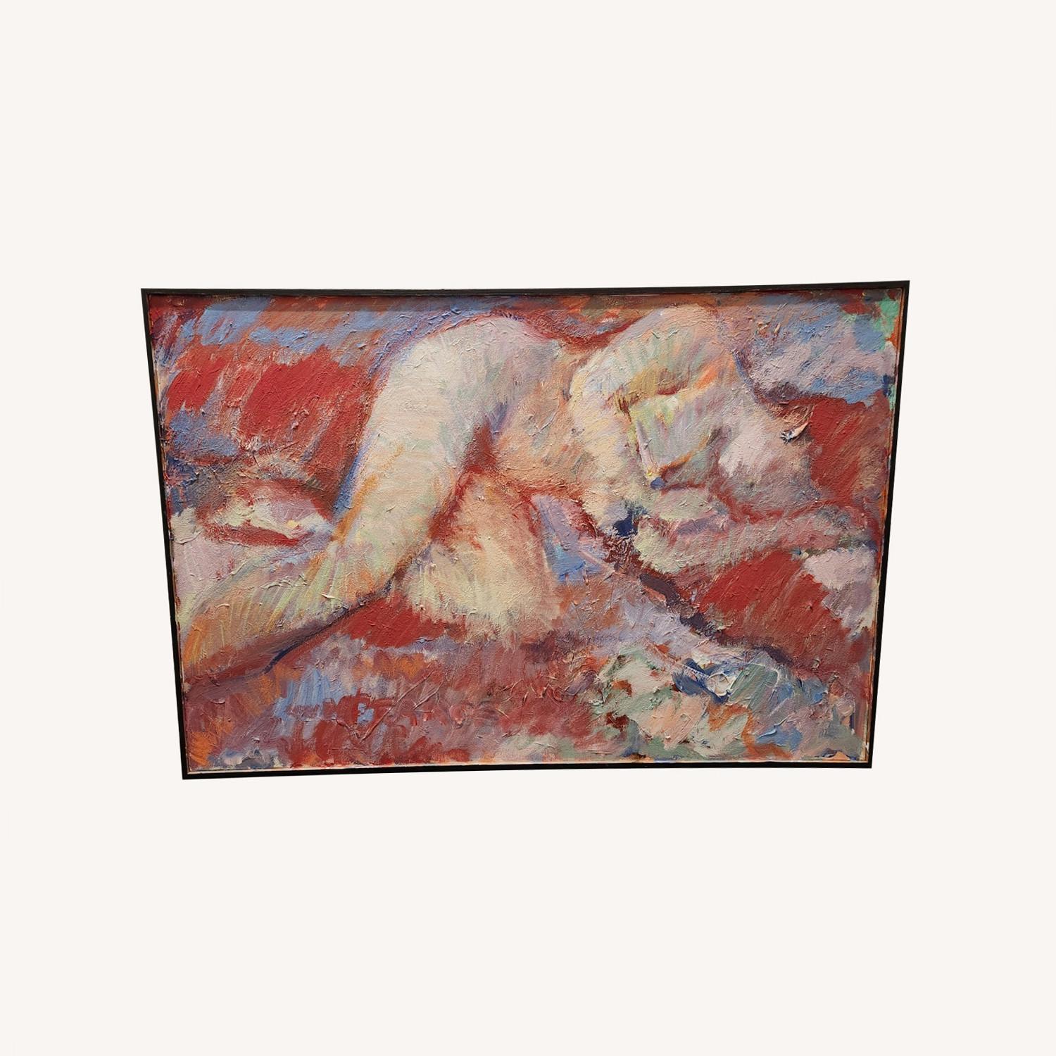 Seller's Notes:Nick Pearce is a Canadian artist. I bought this painting from his studio in 1994 in Victoria, British Columbia. Photos show the front and the back where he signed. The last photo is of his business card that he gave me in 1994. The painting is in a black frame with wire attached for hanging.