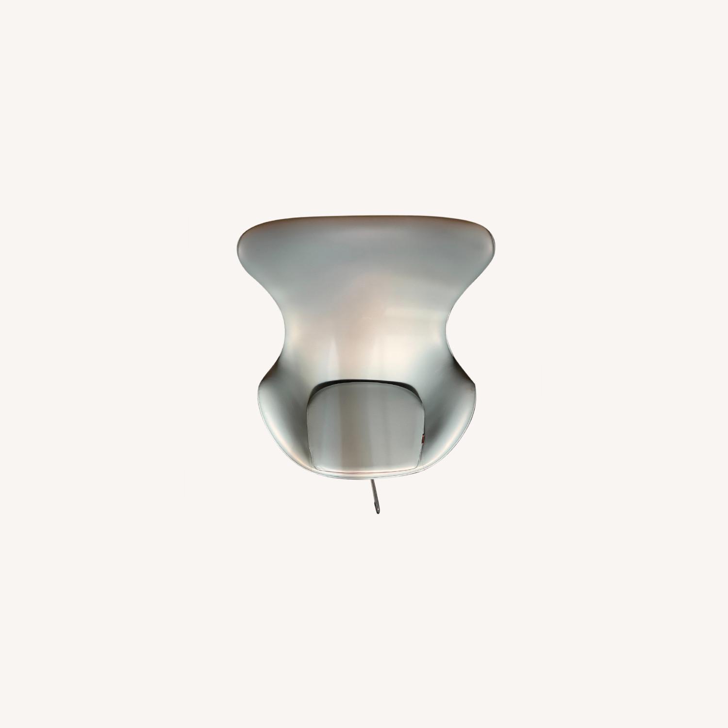 Seller's Notes:2 Custom Made Arne Jacobsen Egg Chairs, imported by Fritz Hansen. Upholstered in leather, color "Acqua" in Mauretania. Originals and tagged as such. Designed by Vicente Wolf.