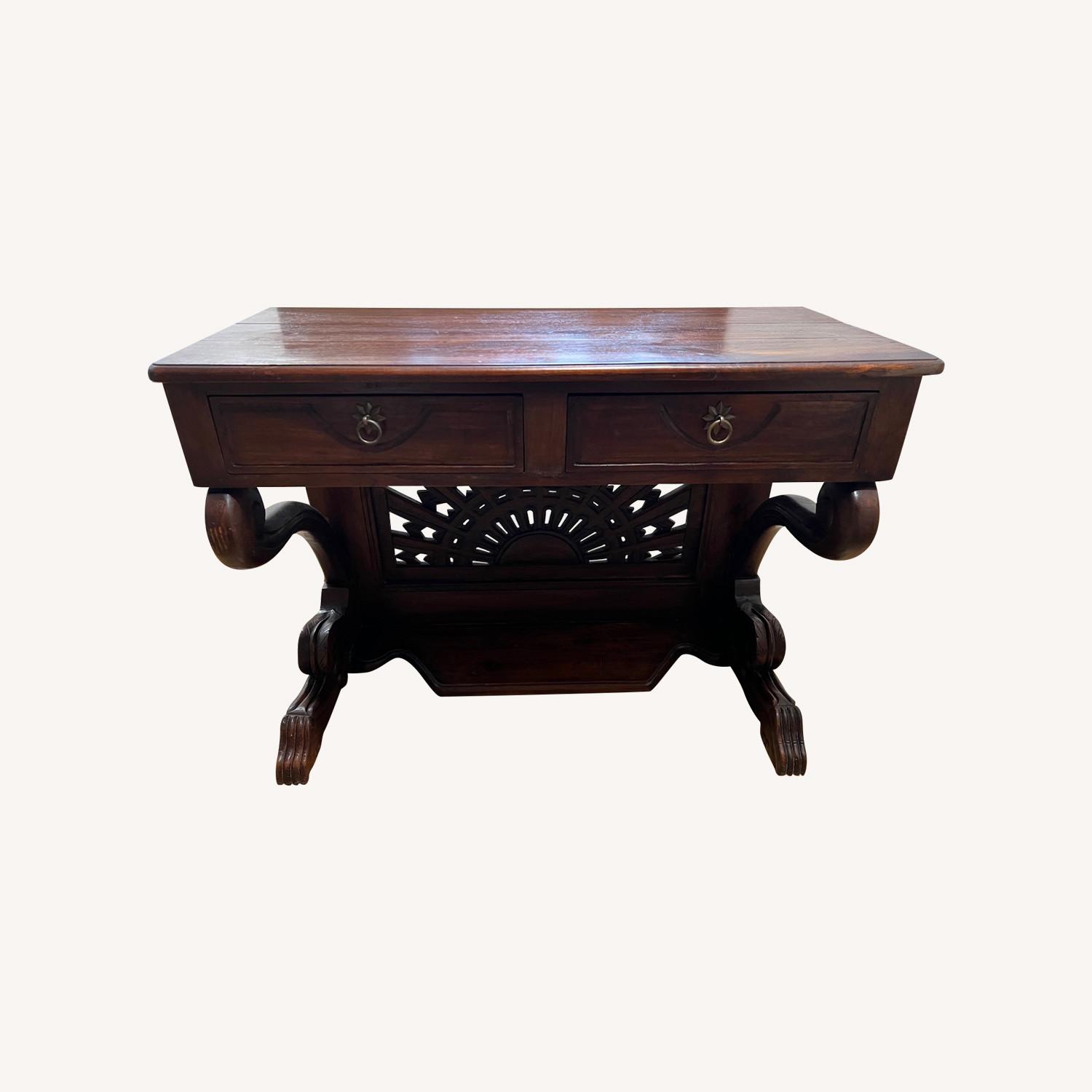 Seller's Notes:This rococo style cherry console table would be perfect for the entryway, living room, or any room in your home! The table has intricate carved back and sits on beautifully shaped curved legs ending in claw feet. It has two drawers in the front. The measurements are: 39 inches Width x 18.5 inches Depth x 29 inches Height