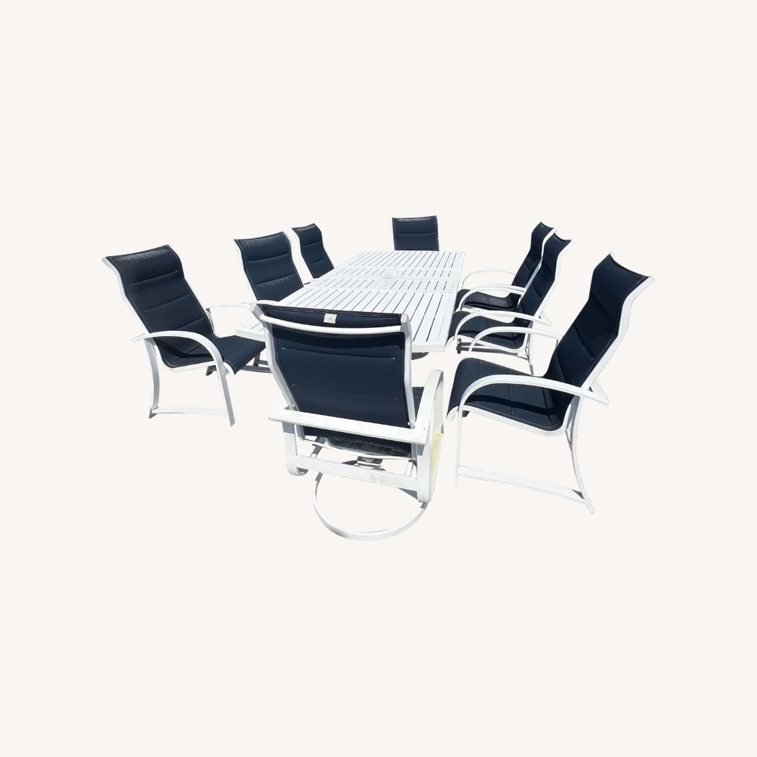 Seller's Notes:Fortunoff table and chairs with 2 swivels. 23 inch insert. Includes working umbrella and stand not shown but available if requested. Few steps if picking up on back deck.
