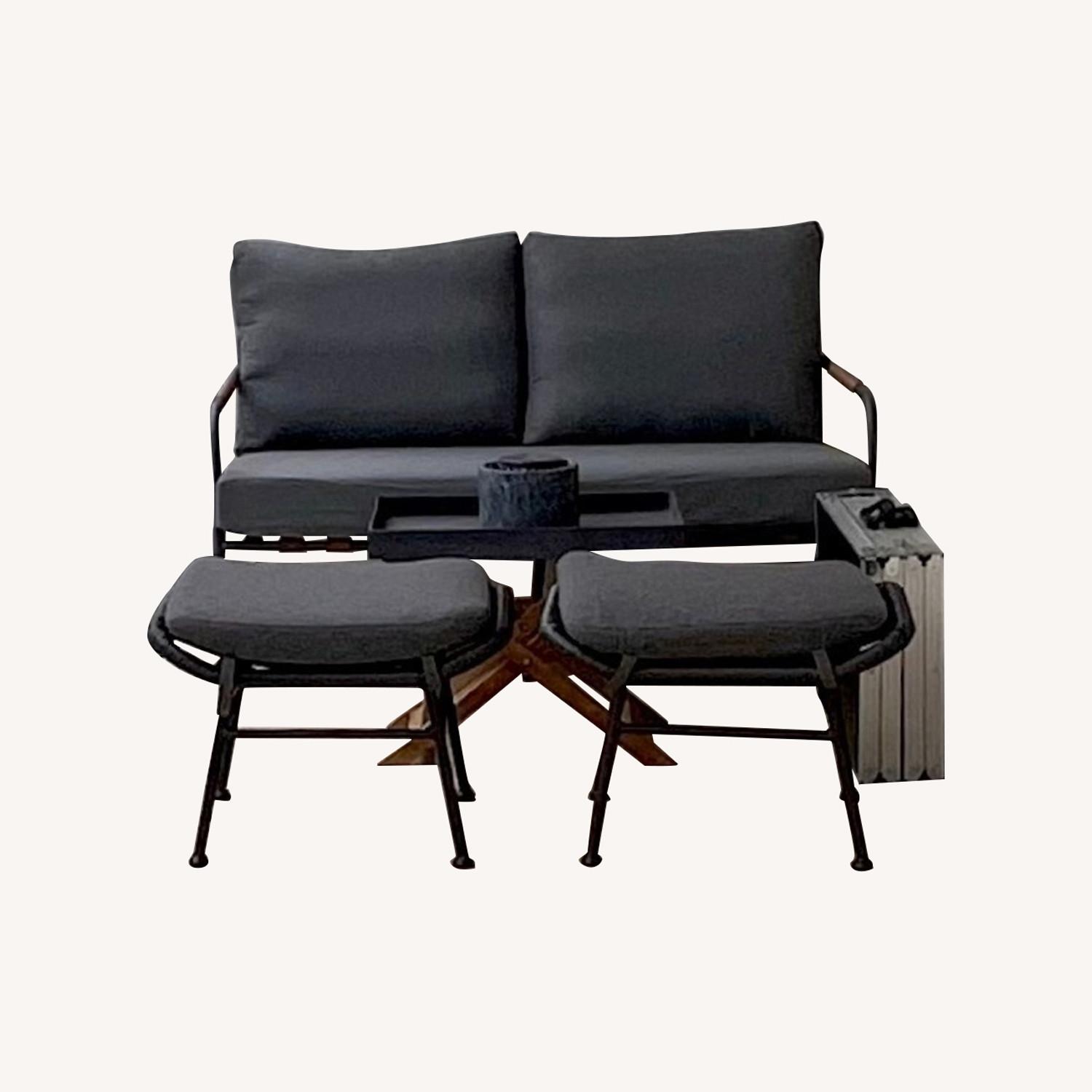 Seller's Notes:Full outdoor furniture set of an outdoor love seat, two ottomans, small center table, and small grey firepit! Originally $1,400, selling for $999 or best offer.