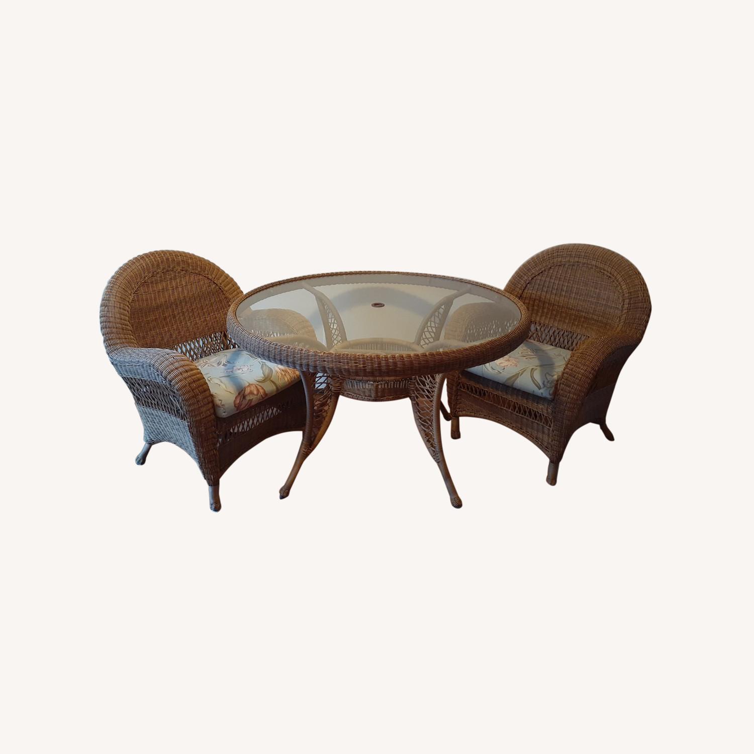 Seller's Notes:Outdoor Wicker Patio Set (Non-fading) 48" Round Glass Table 4 Chairs Rocking Chair Foot Ottoman (2) 40"×24" Oval Glass Coffee Table 24" Round Glass Coffee Table Cusions (as shown in pic) Pillows (as shown in pic) Covers (as shown in pic) Light weight non fading outdoor wicker