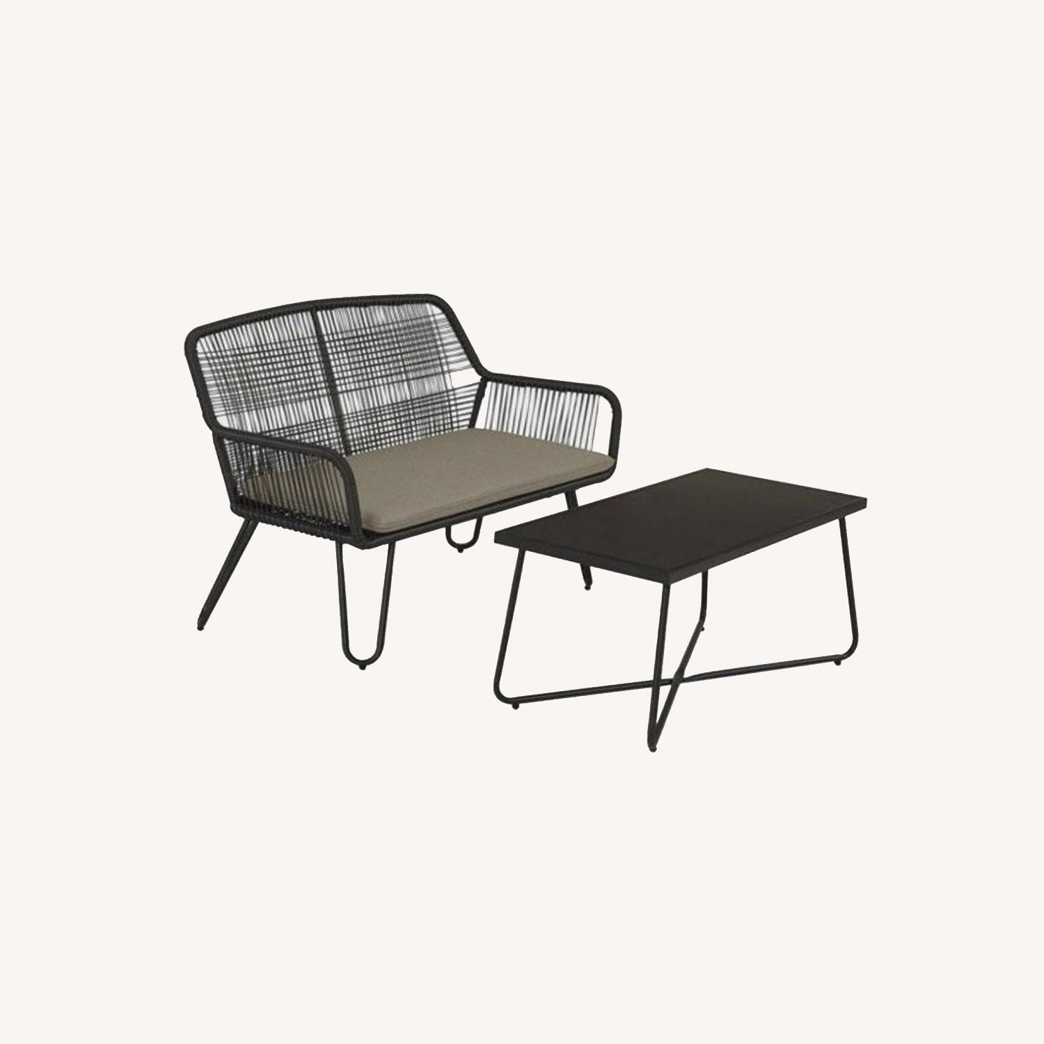 Seller's Notes:Weather-resistant loveseat/bench and matching table from Novogratz/AllModern. Purchased a few months ago and have been outside but shielded from the elements. They look amazing and no different from the day they were set up aside from a little dust. Loveseat is approx 49” X 29” X 33”, made with a solid steel frame wrapped in wicker-like material. Coffee table is approx 40” X 20” X 18” and has a durable glass top. Both loveseat and table can be disassembled. Original price approx $450.