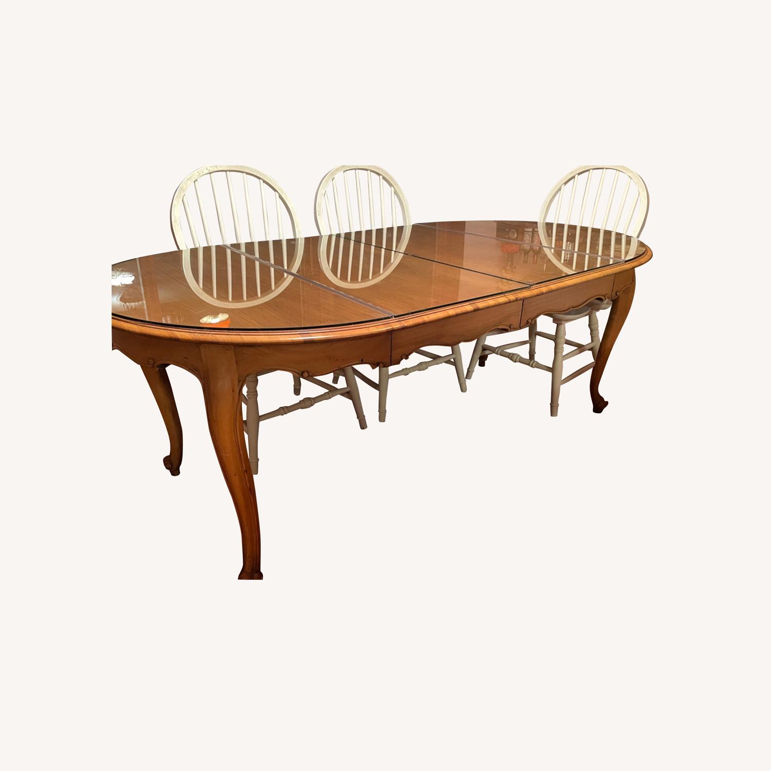 Seller's Notes:This beautiful wood dining room table comes with two removable leaves (18" wide each) that are on a slide mechanism designed by Walter of Wabash (easily adjustable). There is also a custom glass protector that also has "leaves," so it can be made shorter when you remove the leaves. There are a few little scuffs on the glass (barely noticeable) and one visible blemish on the wood table along with a few other tiny scratches (barely visible). Structurally sound--this table has lots of life in it yet! Comes with five chairs.