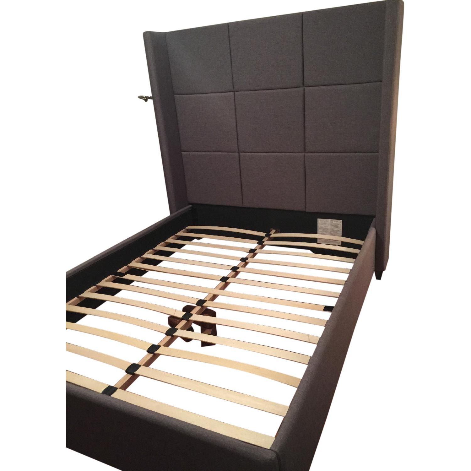Seller's Notes:Bring a touch of modern elegance to your bedroom with this lovely Jillian upholstered bed. A slightly textured grey fabric and clean lines compliment this bed. The 69 inch high headboard is sure to make this bed a statement piece in any home. Transform your master bedroom into an oasis of comfort and relaxation when you decorate with this Jillian upholstered bed. The dramatic headboard adds depth to smaller rooms, while the simple yet elegant design of the foot board and side rails let you easily match this bed to a variety of linens and shams. Can use just a matt., or a matt. and a box spr. for additional height. Two legs that support the beam that runs through the middle of the slats have broken off, as an alternative we've stacked two bricks to support. You could use something else sturdy. Bed also functions without the support, but nice to have. We paid just over $500 for the bed and have priced it to reflect the two broken beams. We use every day without an issue. Beautiful bed. Set includes: Headboard, footboard, side rails, support slats Materials: 100-percent polyester fabric, MDF, rubber wood, pine Finish: Black Upholstery materials: 100-percent polyester Upholstery color: Grey 13 cross slats are included for matt. support 3-inch clearance from the floor to the bottom of the platform Dimensions: 69 inches high x 69 inches wide x 84 inches deep http://www.overstock.com/Home-Garden/Jillian-Upholstered-Queen-Bed/6032836/product.html