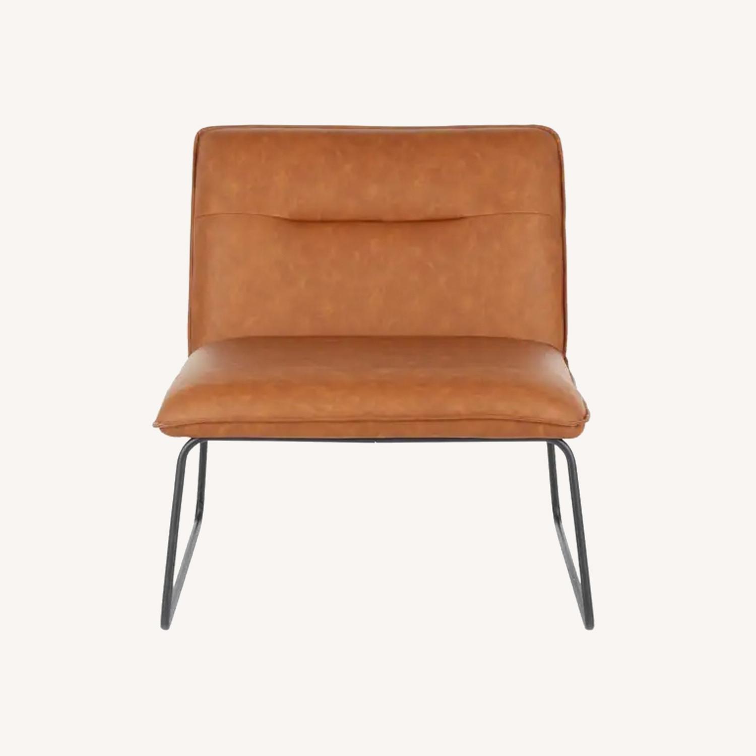 Seller's Notes:A cool, sleek, slim style accent chair complete with a horizontal tufted back accent on its sleek faux leather upholstery, this industrially inclined faux leather accent chair sits atop splayed, black metal sleigh legs, arriving in a rich camel color. I ordered this beautiful accent chair that perfectly fit the decor of my apartment, but didn't get much use due to COVID and now I'm selling it since I'm moving.