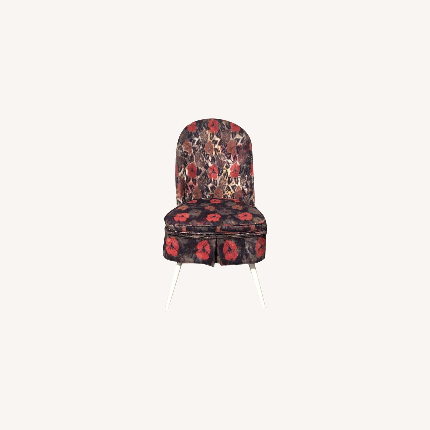 Seller's Notes:A pair of dining / side chairs with custom floral jacquard slipcovers. The chair frame is powder coated steel in color white. The seat under slipcover is wood stained in a walnut color. The chairs are very sturdy. The custom floral jacquard slipcovers feature exposed seam details and seat cushions with piped edging. The slip covers are backed in black felt. Slip covers attach to the chair frame with hidden ties which are not visible from the outside - holding the slip cover securely in place. Overall dimensions: 20"L x 20"W x 39"H Seat dimensions: 18.5"L x 18.5"W Top of seat cushion from floor: 18.5"