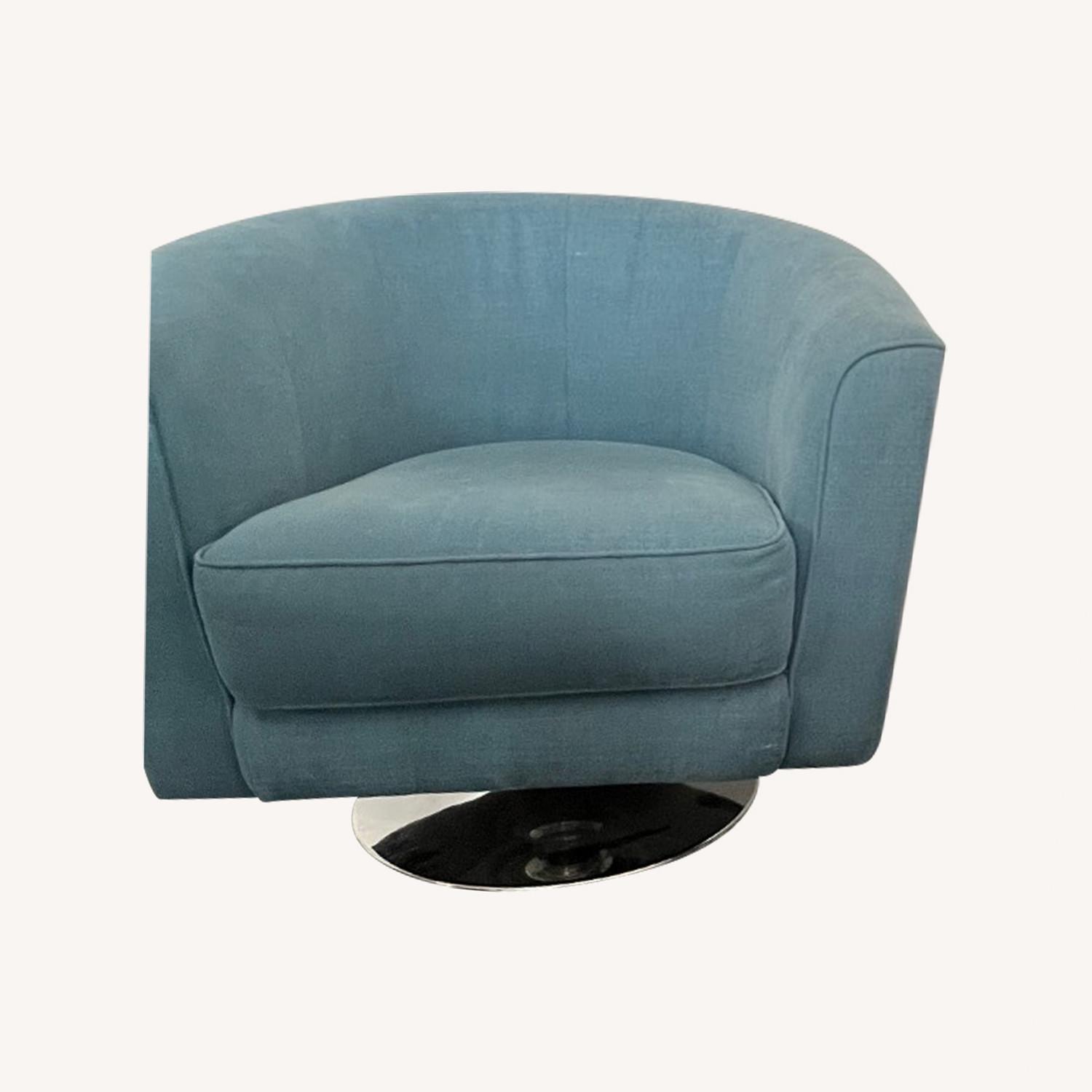 Seller's Notes:Pair of mid-century modern barrel-back swivel chairs with chrome bases covered in Pierre Frey blue cotton.