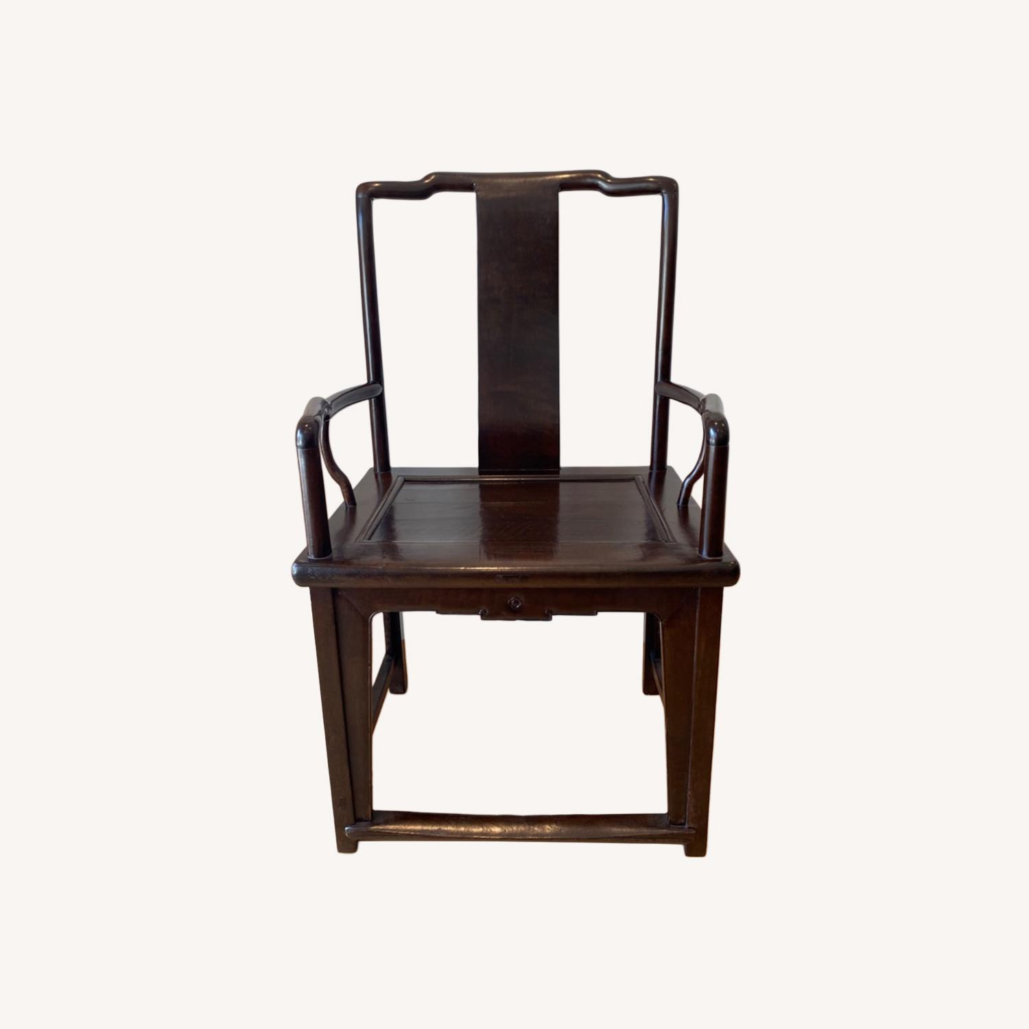 Seller's Notes:A pair of early 19th century, simple, elegant scholar's armchairs each with a humpbacked headrest supported by "S" curved splat on hard wood seat. The shaped armrest continues to front legs. The square legs are reinforced by box stretchers. Purchased from reputable Hong Kong antique dealer. Recent crack in top bar on one chair will require some repair (see photos).