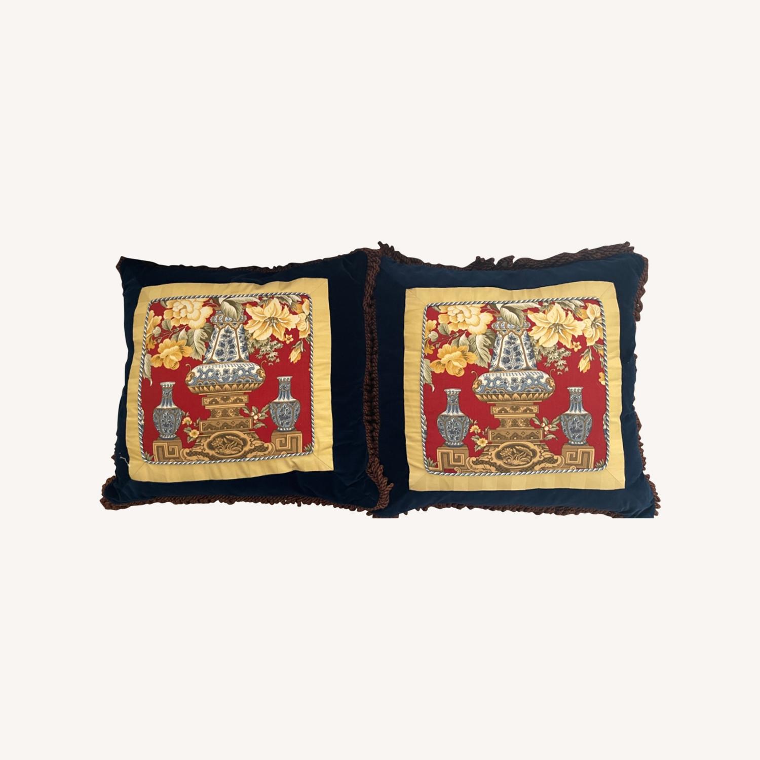 Seller's Notes:These are custom throw pillows that cost $400/ea. They’re piped in thick fringe and feature a patterned red fabric that pulls in the navy velour and yellow satin that frame it. The back side features the silk yellow fabric with colored buttons to match. The only flaw is the mark on one of the yellow buttons (see photo).