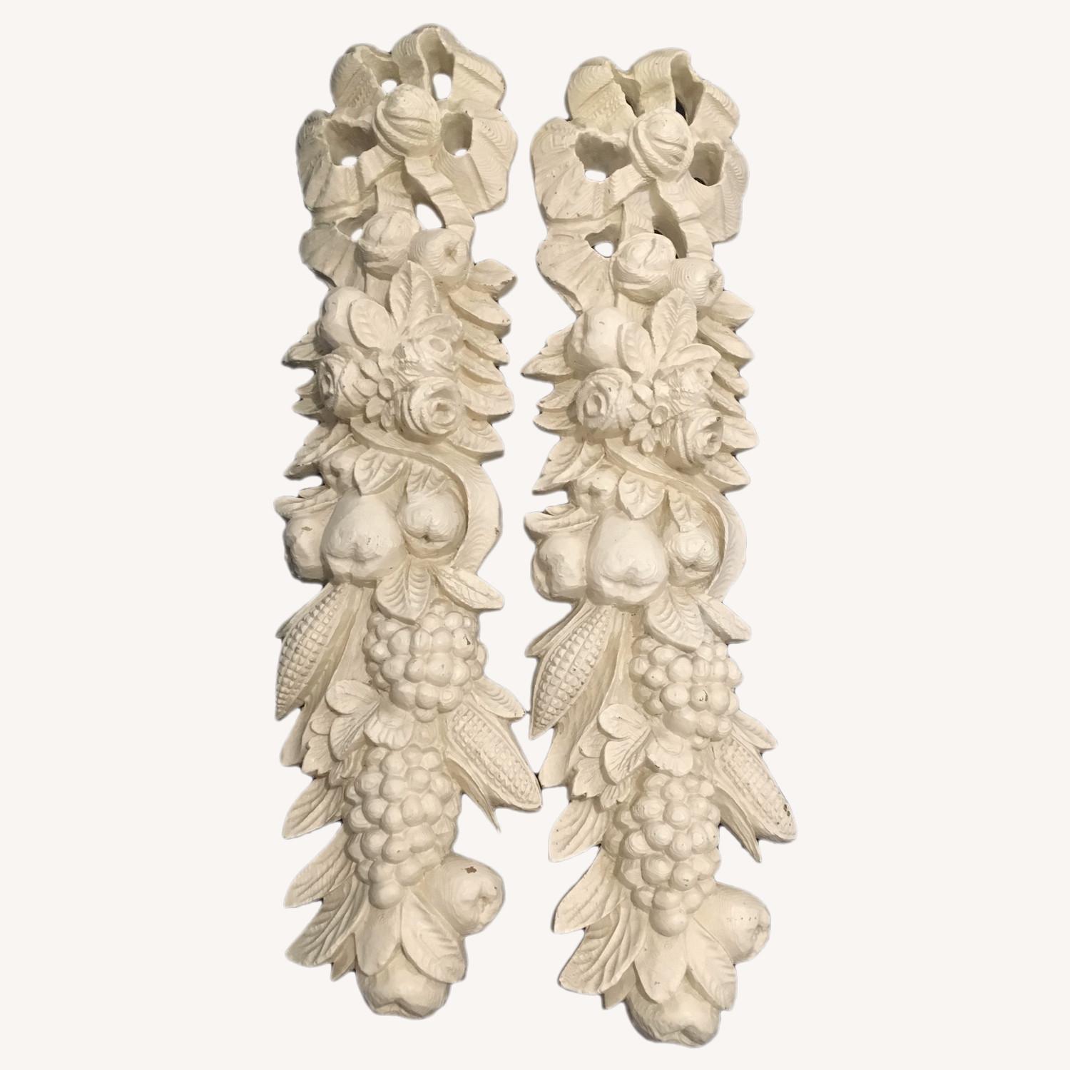 Seller's Notes:This pair of off-white carved wood decorative sculptures make an awesome wall accent! Likely from the 1960's, they're eye-catching and distinctive, without needing to be the main event on a wall. The sculptures are light weight. Decorating ideas: Warm up a lobby or hallway, or bring festivity to kitchen. They'd look good on either side of a door, window or fireplace. The hook on the back is for hanging them vertically, but they could be hung horizontally if you so choose. They could be spray-painted to match your decor, or you could paint the individual fruits. I could even see these in gold paint! Depending upon the context, they could range from super classy to super campy.