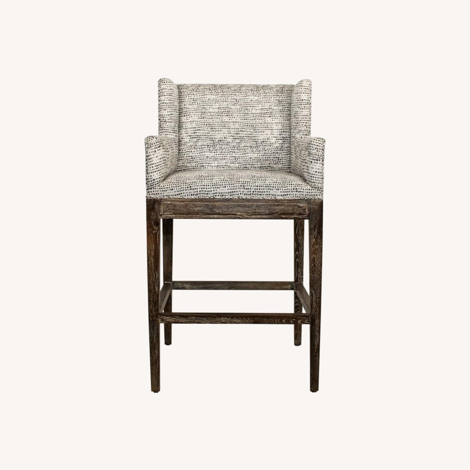 Seller's Notes:Pair of Restoration Hardware “Morgan Track Arm” Barstools Tapered legs – a signature of midcentury design – complement these stool's strikingly angular silhouette. A wooden frame supports the tailored seat and back, providing visual contrast and adding warmth. Dimensions: 24x23x44, Seat Height 30" Very Good - Used Condition with Very Minimal Wear